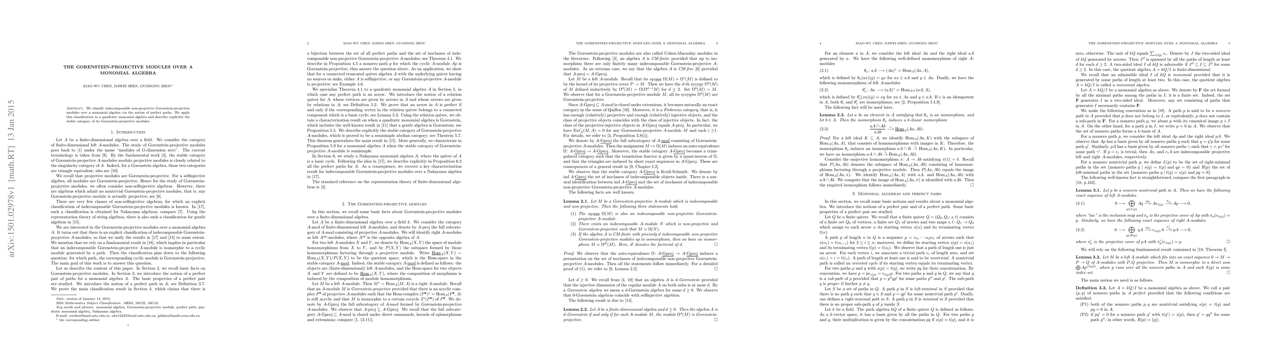 This paper classifies indecomposable non-projective Gorenstein-projective modules over a monomial algebra using perfect paths and applies this classification to a quadratic monomial algebra, providing an explicit description of its stable category.