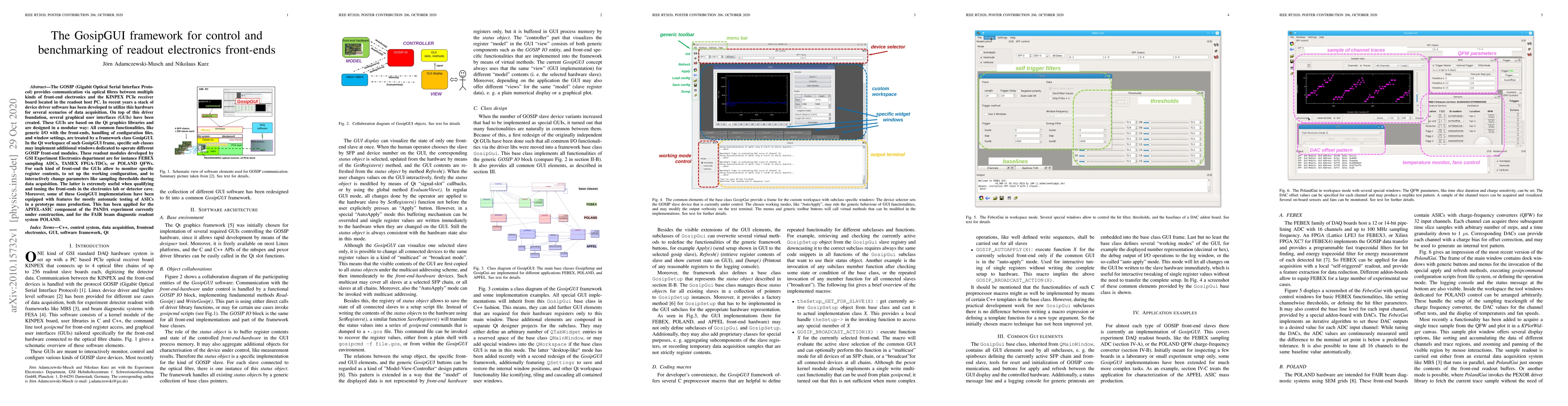 The GosipGUI framework provides a modular graphical user interface for controlling and benchmarking various readout electronics front-ends via the GOSIP protocol, enabling configuration, monitoring, and parameter tuning for different modules like ADCs, FPGA-TDCs, and QFWs. It also facilitates automated testing for ASICs in mass production scenarios.