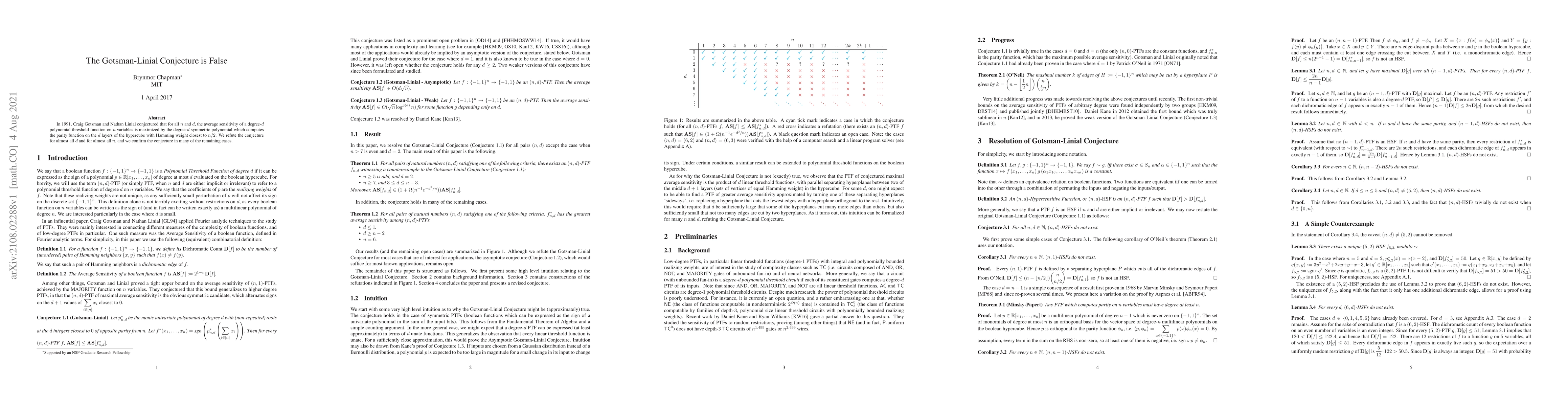 This research refutes Gotsman-Linial conjecture for most values of d and n, while confirming it for some remaining cases. The conjecture concerned the average sensitivity of degree-d polynomial threshold functions on n variables.