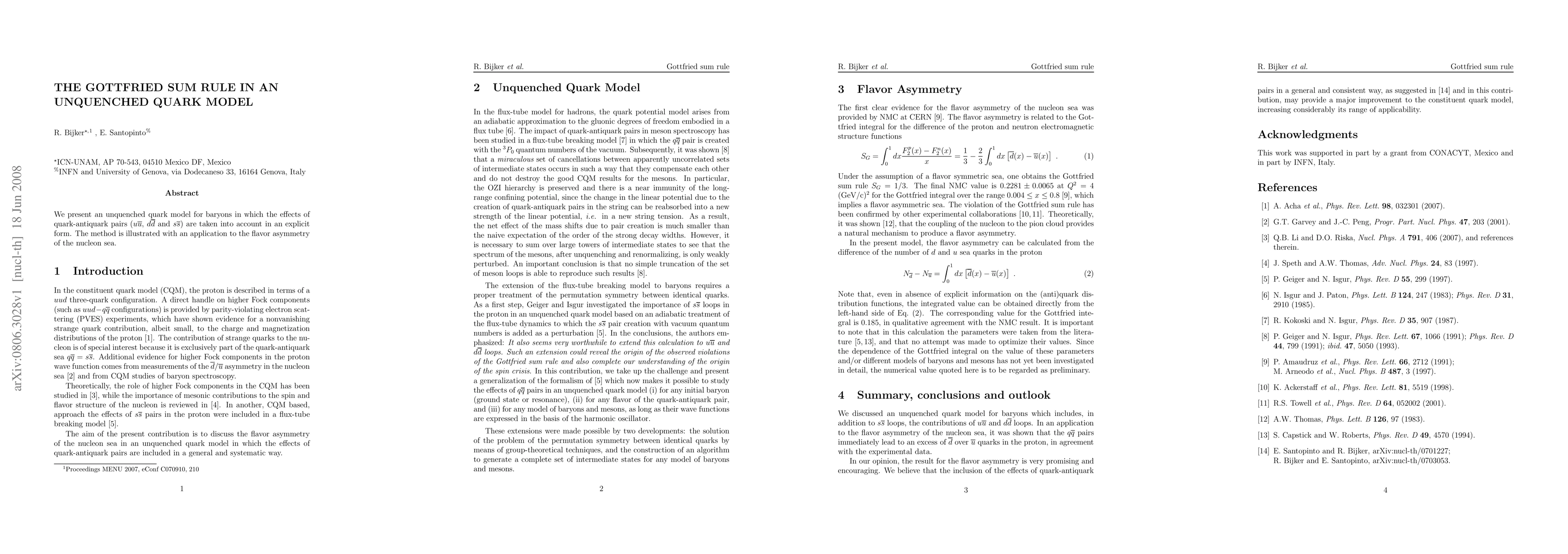 This paper develops an unquenched quark model for baryons that explicitly considers quark-antiquark pairs, focusing on light flavors u, d, and s, and applies it to analyze the flavor asymmetry in the nucleon sea, verifying the Gottfried sum rule.