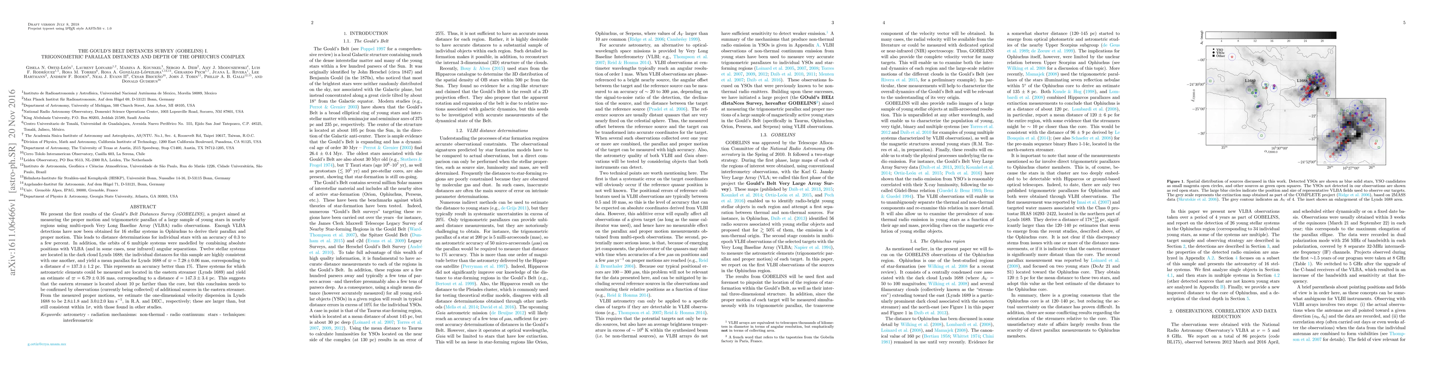 We present the first results of the Gould's Belt Distances Survey (GOBELINS), a project aimed at measuring the proper motion and trigonometric parallax of a large sample of young stars in nearby regions using multi-epoch Very Long Baseline Array (VLBA) radio observations. Enough VLBA detections have now been obtained for 16 stellar systems in Ophiuchus to derive their parallax and proper motion. This leads to distance determinations for individual stars with an accuracy of 0.3 to a few percent. In addition, the orbits of 6 multiple systems were modelled by combining absolute positions with VLBA (and in some cases, near infrared) angular separations. Twelve stellar systems are located in the dark cloud Lynds 1688, the individual distances for this sample are highly consistent with one another, and yield a mean parallax for Lynds 1688 of $\varpi=7.28\pm0.06$ mas, corresponding to a distance $d=137.3\pm1.2$ pc. This represents an accuracy better than 1%. Three systems for which astrometric elements could be measured are located in the eastern streamer (Lynds 1689) and yield an estimate of $\varpi=6.79\pm0.16$ mas, corresponding to a distance $d=147.3\pm3.4$ pc. This suggests that the eastern streamer is located about 10 pc farther than the core, but this conclusion needs to be confirmed by observations (currently being collected) of additional sources in the eastern streamer. From the measured proper motions, we estimate the one-dimensional velocity dispersion in Lynds 1688 to be 2.8$\pm$1.8 and 3.0$\pm$2.0 ${\rm km~s}^{-1}$, in R.A. and DEC., respectively, these are larger than, but still consistent within $1\sigma$, with those found in other studies.