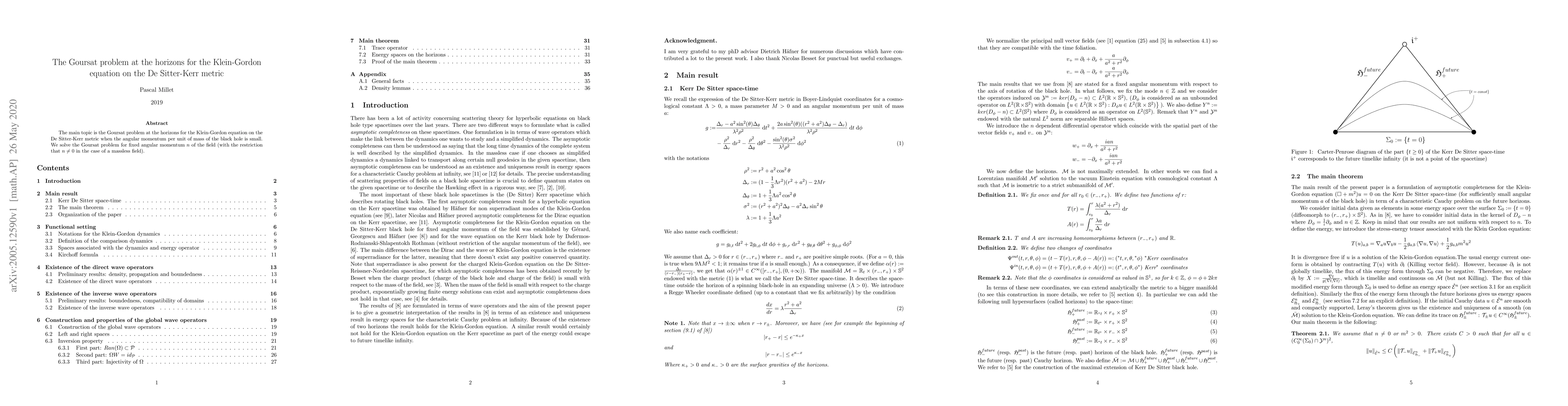 Summary: This paper addresses the Goursat problem at the horizons for the Klein-Gordon equation on the De Sitter-Kerr metric, focusing on scenarios where the black hole's angular momentum per unit mass is small. It provides a solution for the problem under fixed angular momentum conditions, particularly noting restrictions for massless fields.
