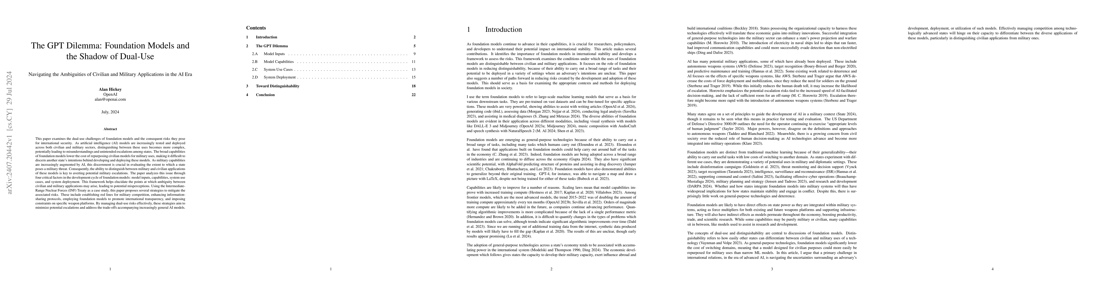 This paper explores the dual-use dilemma of foundation models, focusing on how their broad capabilities complicate the distinction between civilian and military applications, which can lead to international security risks and unintended escalations. It proposes strategies like establishing red lines and enhancing transparency to mitigate these risks.