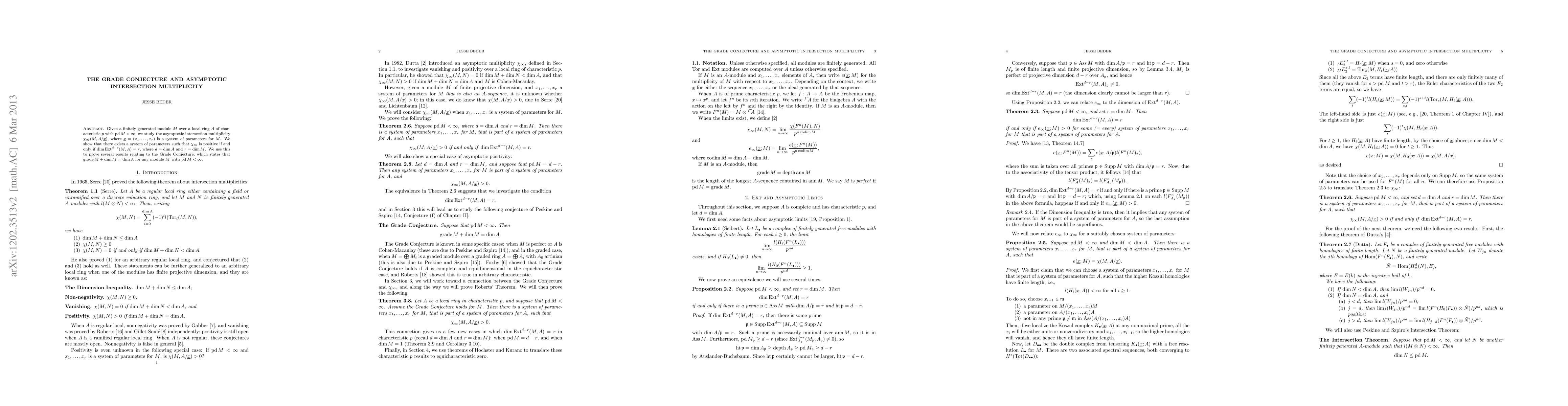 Given a finitely generated module $M$ over a local ring $A$ of characteristic $p$ with $\pd M < \infty$, we study the asymptotic intersection multiplicity $\chi_\infty(M, A/\underline{x})$, where $\underline{x} = (x_1, \ldots, x_r)$ is a system of parameters for $M$. We show that there exists a system of parameters such that $\chi_\infty$ is positive if and only if $\dim \Ext^{d-r}(M, A) = r$, where $d = \dim A$ and $r = \dim M$. We use this to prove several results relating to the Grade Conjecture, which states that $\grade M + \dim M = \dim A$ for any module $M$ with $\pd M < \infty$.