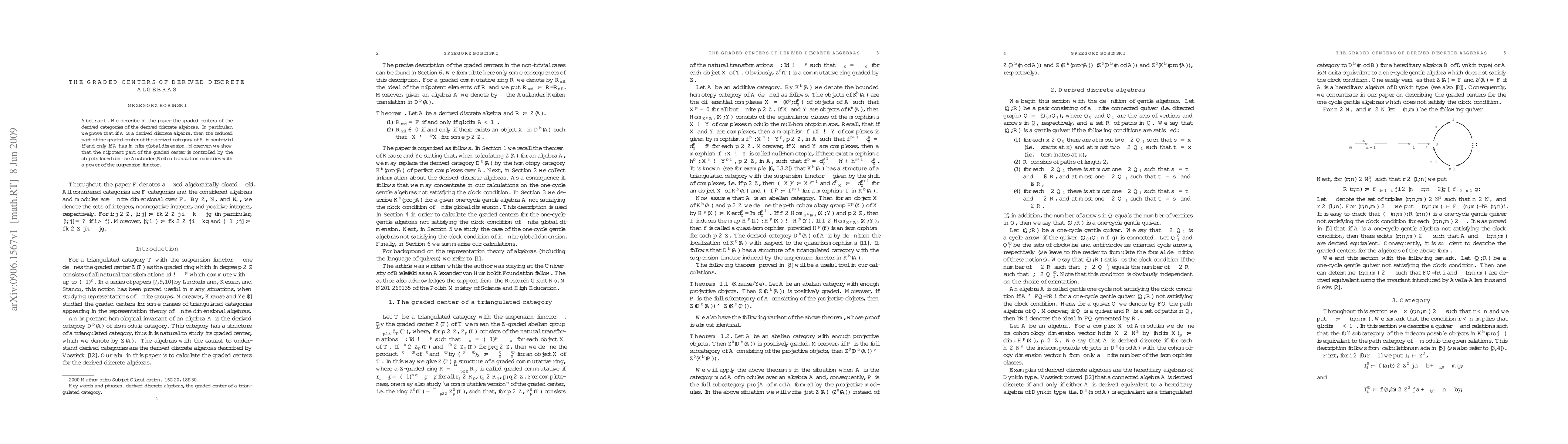 We describe in the paper the graded centers of the derived categories of the derived discrete algebras. In particular, we prove that if $A$ is a derived discrete algebra, then the reduced part of the graded center of the derived category of $A$ is nontrivial if and only if $A$ has infinite global dimension. Moreover, we show that the nilpotent part of the graded center is controlled by the objects for which the Auslander--Reiten translation coincides with a power of the suspension functor.