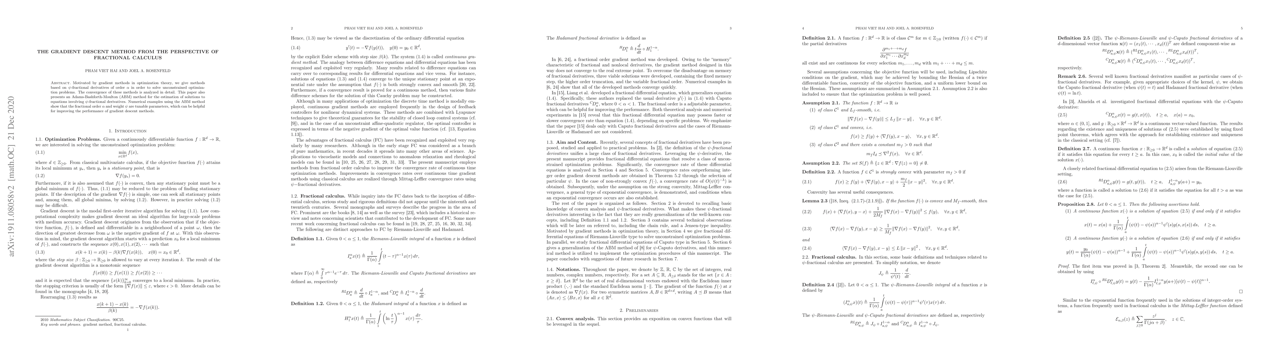 Motivated by gradient methods in optimization theory, we give methods based on $\psi$-fractional derivatives of order $\alpha$ in order to solve unconstrained optimization problems. The convergence of these methods is analyzed in detail. This paper also presents an Adams-Bashforth-Moulton (ABM) method for the estimation of solutions to equations involving $\psi$-fractional derivatives. Numerical examples using the ABM method show that the fractional order $\alpha$ and weight $\psi$ are tunable parameters, which can be helpful for improving the performance of gradient descent methods.
