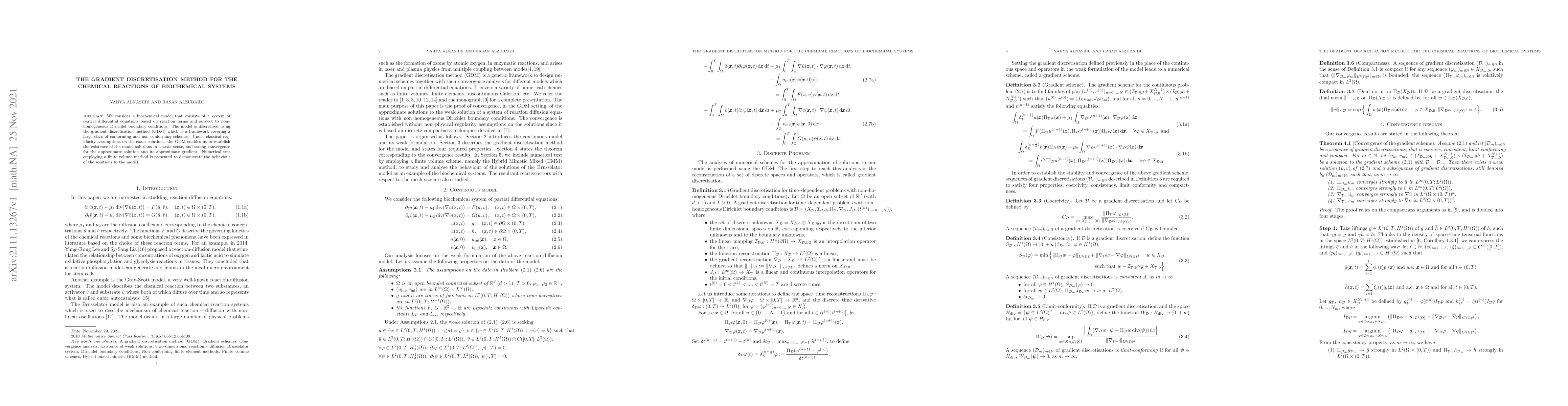 We consider a biochemical model that consists of a system of partial differential equations based on reaction terms and subject to non--homogeneous Dirichlet boundary conditions. The model is discretised using the gradient discretisation method (GDM) which is a framework covering a large class of conforming and non conforming schemes. Under classical regularity assumptions on the exact solutions, the GDM enables us to establish the existence of the model solutions in a weak sense, and strong convergence for the approximate solution and its approximate gradient. Numerical test employing a finite volume method is presented to demonstrate the behaviour of the solutions to the model.
