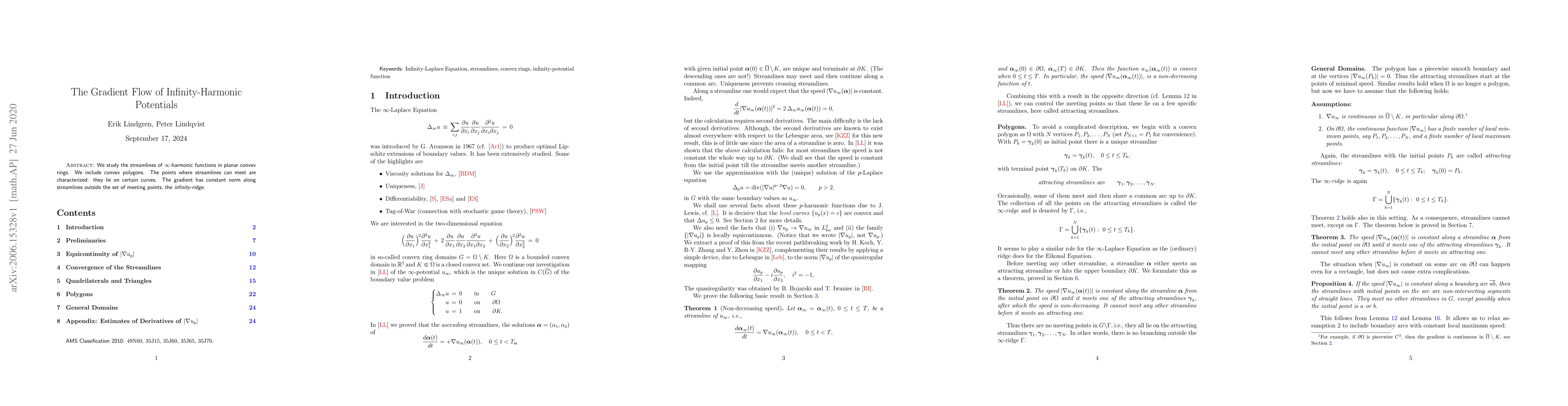 Summary: This paper investigates the streamlines of $\infty$-harmonic functions within planar convex rings, including polygons, and identifies specific curves where streamlines meet. It reveals that the gradient norm remains constant along these streamlines, excluding the "infinity-ridge" where meeting points occur.