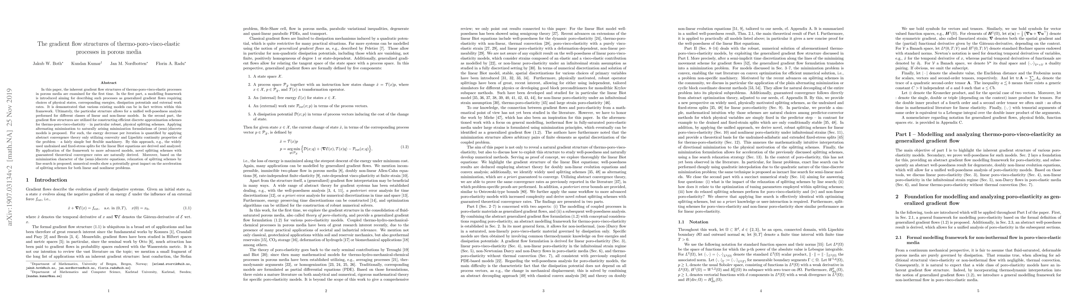 This paper introduces a modelling framework for thermo-poro-visco-elastic processes in porous media as generalized gradient flows, enabling a unified well-posedness analysis. It also proposes efficient discrete approximation schemes, including robust splitting methods with guaranteed convergence rates, and demonstrates the potential for accelerated convergence through line search relaxation.