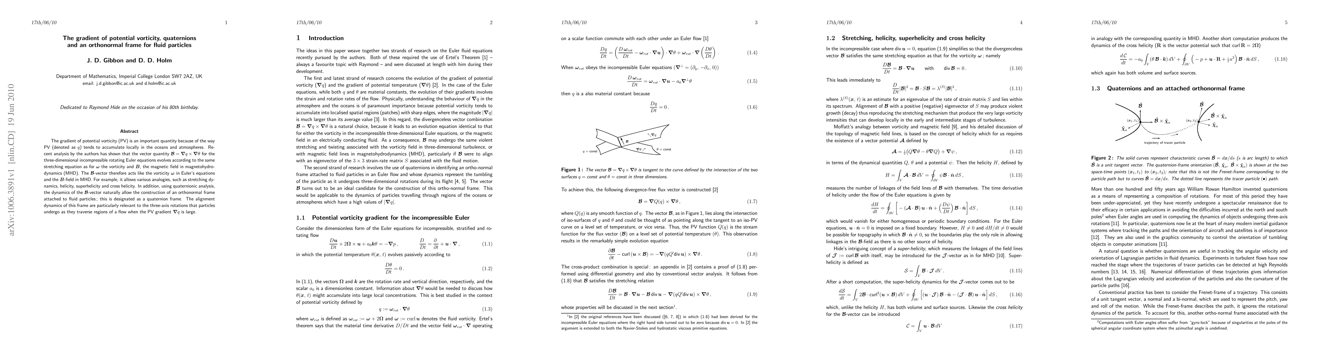 This research introduces the gradient of potential vorticity (PV), $dB = nabla q imes nabla heta$, as a crucial vector quantity that follows similar stretching dynamics as vorticity and magnetic fields in Euler and MHD equations. Utilizing quaternionic analysis, it constructs an orthonormal frame ( quaternion frame) attached to fluid particles, which is significant for understanding the rotational dynamics in flows with large PV gradient.