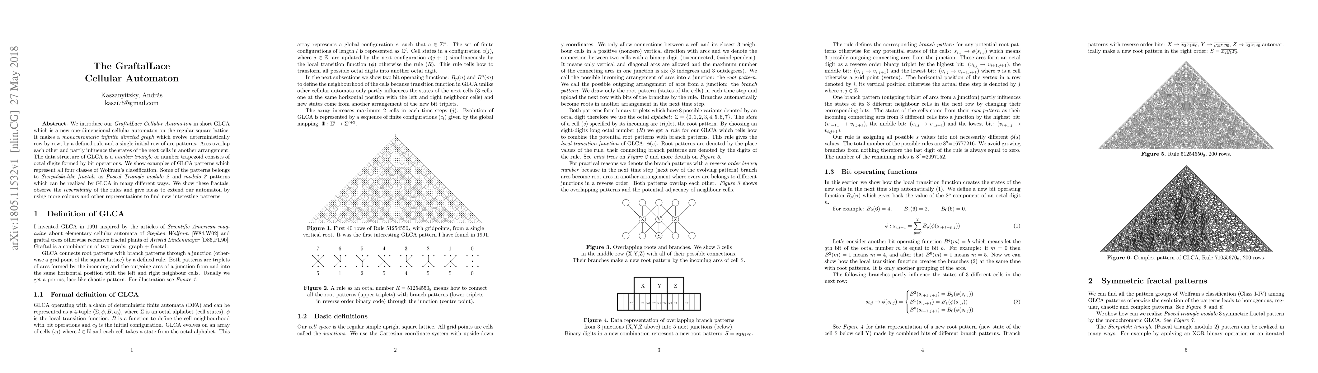 The paper introduces the GraftalLace Cellular Automaton (GLCA), a one-dimensional cellular automaton operating on a regular square lattice, which constructs monochromatic infinite directed graphs resembling octal number triangles or trapezoids using bit operations to influence neighboring cells.