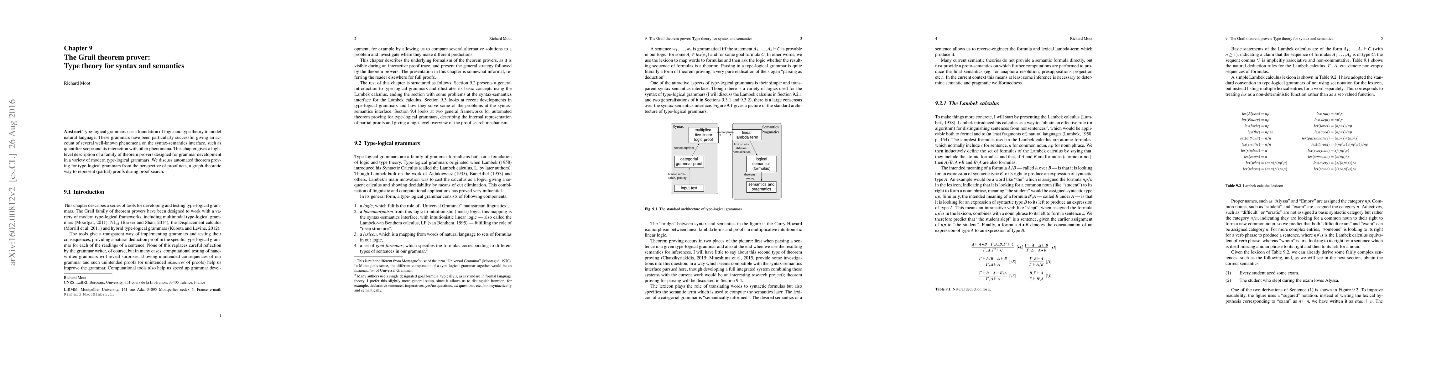 The Grail theorem prover provides tools for designing and testing type-logical grammars, integrating syntax and semantics through logic and type theory. It is freely available and has been successfully applied to various language phenomena such as coordination and quantifier scope.