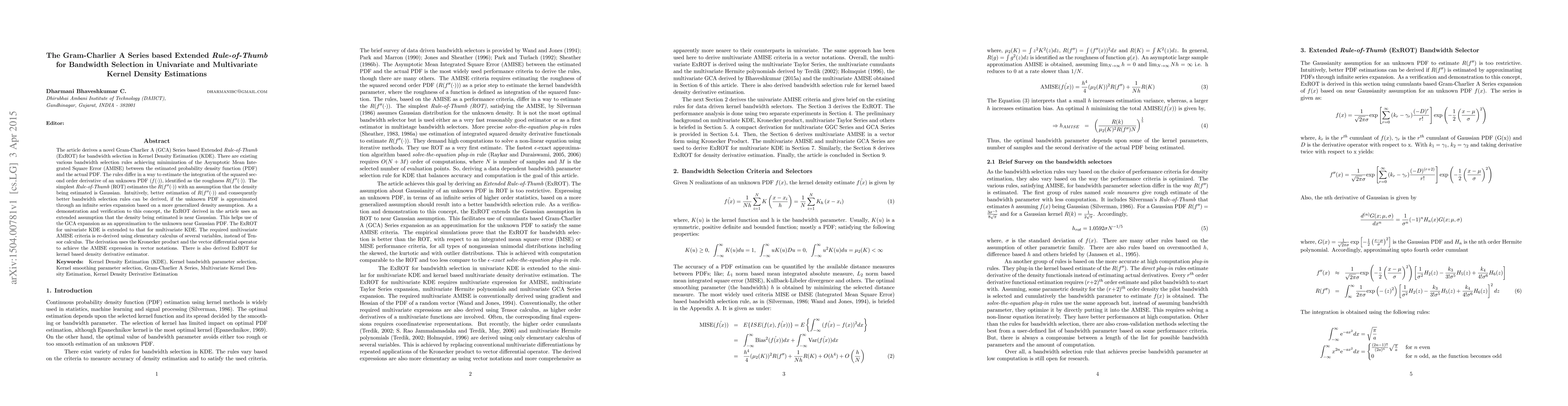 The article derives a novel Gram-Charlier A (GCA) Series based Extended Rule-of-Thumb (ExROT) for bandwidth selection in Kernel Density Estimation (KDE). There are existing various bandwidth selection rules achieving minimization of the Asymptotic Mean Integrated Square Error (AMISE) between the estimated probability density function (PDF) and the actual PDF. The rules differ in a way to estimate the integration of the squared second order derivative of an unknown PDF $(f(\cdot))$, identified as the roughness $R(f''(\cdot))$. The simplest Rule-of-Thumb (ROT) estimates $R(f''(\cdot))$ with an assumption that the density being estimated is Gaussian. Intuitively, better estimation of $R(f''(\cdot))$ and consequently better bandwidth selection rules can be derived, if the unknown PDF is approximated through an infinite series expansion based on a more generalized density assumption. As a demonstration and verification to this concept, the ExROT derived in the article uses an extended assumption that the density being estimated is near Gaussian. This helps use of the GCA expansion as an approximation to the unknown near Gaussian PDF. The ExROT for univariate KDE is extended to that for multivariate KDE. The required multivariate AMISE criteria is re-derived using elementary calculus of several variables, instead of Tensor calculus. The derivation uses the Kronecker product and the vector differential operator to achieve the AMISE expression in vector notations. There is also derived ExROT for kernel based density derivative estimator.