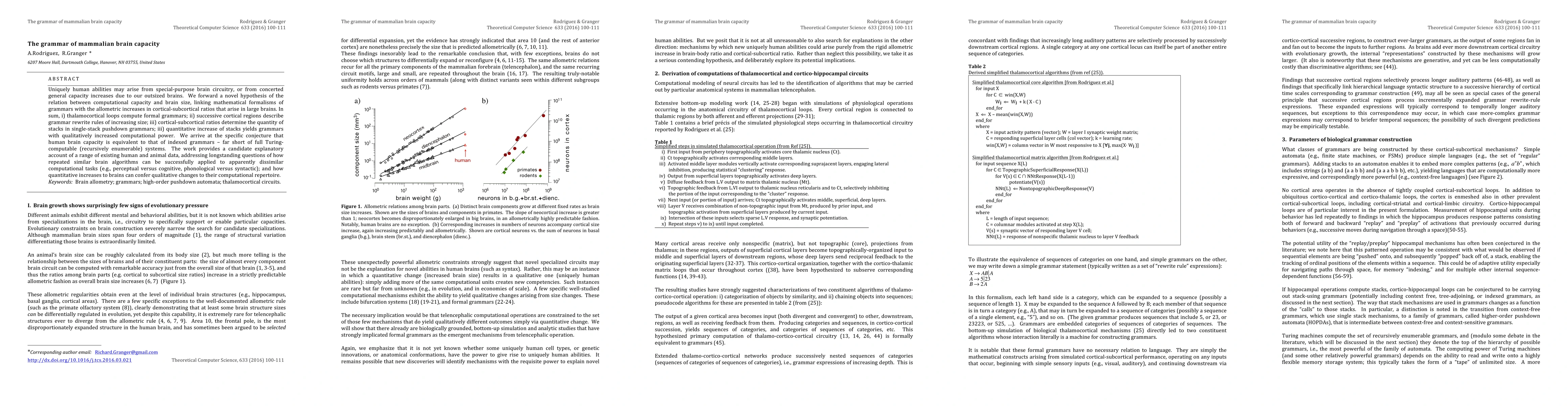 Uniquely human abilities may arise from special-purpose brain circuitry, or from concerted general capacity increases due to our outsized brains. We forward a novel hypothesis of the relation between computational capacity and brain size, linking mathematical formalisms of grammars with the allometric increases in cortical-subcortical ratios that arise in large brains. In sum, i) thalamocortical loops compute formal grammars; ii) successive cortical regions describe grammar rewrite rules of increasing size; iii) cortical-subcortical ratios determine the quantity of stacks in single-stack pushdown grammars; iii) quantitative increase of stacks yields grammars with qualitatively increased computational power. We arrive at the specific conjecture that human brain capacity is equivalent to that of indexed grammars, far short of full Turing-computable (recursively enumerable) systems. The work provides a candidate explanatory account of a range of existing human and animal data, addressing longstanding questions of how repeated similar brain algorithms can be successfully applied to apparently dissimilar computational tasks (e.g., perceptual versus cognitive, phonological versus syntactic); and how quantitative increases to brains can confer qualitative changes to their computational repertoire.