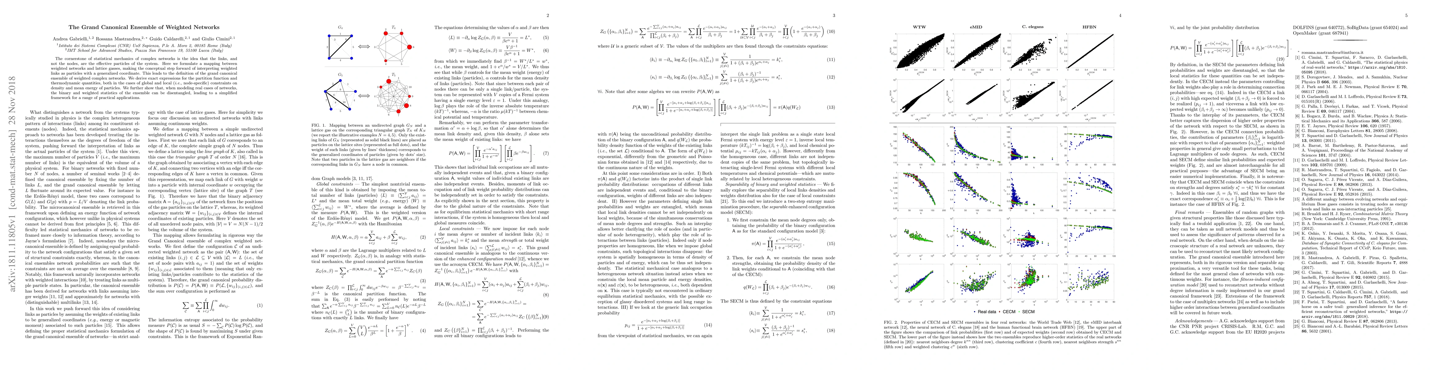 The cornerstone of statistical mechanics of complex networks is the idea that the links, and not the nodes, are the effective particles of the system. Here we formulate a mapping between weighted networks and lattice gasses, making the conceptual step forward of interpreting weighted links as particles with a generalised coordinate. This leads to the definition of the grand canonical ensemble of weighted complex networks. We derive exact expressions for the partition function and thermodynamic quantities, both in the cases of global and local (i.e., node-specific) constraints on density and mean energy of particles. We further show that, when modelling real cases of networks, the binary and weighted statistics of the ensemble can be disentangled, leading to a simplified framework for a range of practical applications.