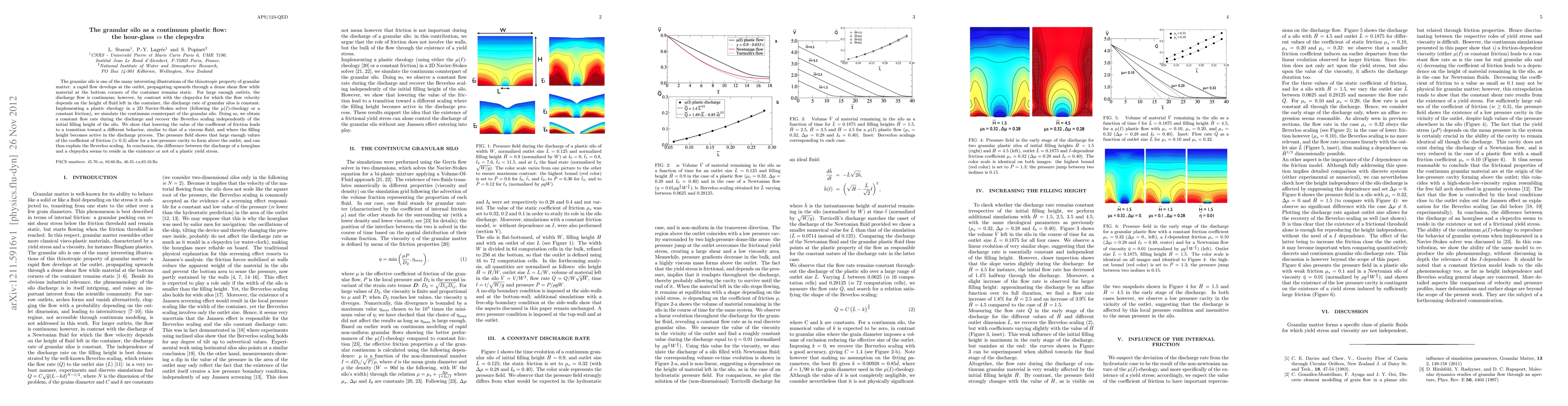 This paper investigates the continuum plastic flow in granular silos, demonstrating how a constant discharge rate contrasts with the height-dependent flow in clepsydras. Simulations using a 2D Navier-Stokes solver reveal that high friction coefficients maintain a constant flow rate, explaining the Beverloo scaling, while lower friction leads to a behavior akin to viscous fluids.