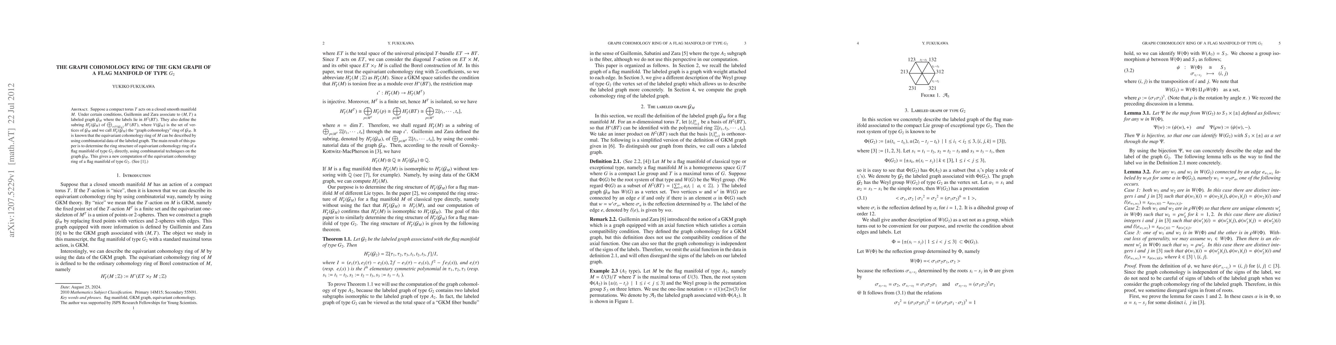 Suppose a compact torus $T$ acts on a closed smooth manifold $M$. Under certain conditions, Guillemin and Zara associate to $(M, T)$ a labeled graph $\mG_M$ where the labels lie in $H^2(BT)$. They also define the subring $H_T^*(\mG_M)$ of $\bigoplus_{v\in V(\mG_M)}H^*(BT)$, where $V(\mG_M)$ is the set of vertices of $\mG_M$ and we call $H_T^*(\mG_M)$ the "graph cohomology" ring of $\mG_M$. It is known that the equivariant cohomology ring of $M$ can be described by using combinatorial data of the labeled graph. The main result of this paper is to determine the ring structure of equivariant cohomology ring of a flag manifold of type $G_2$ directly, using combinatorial techniques on the graph $\mG_M$. This gives a new computation of the equivariant cohomology ring of a flag manifold of type $G_2$.
