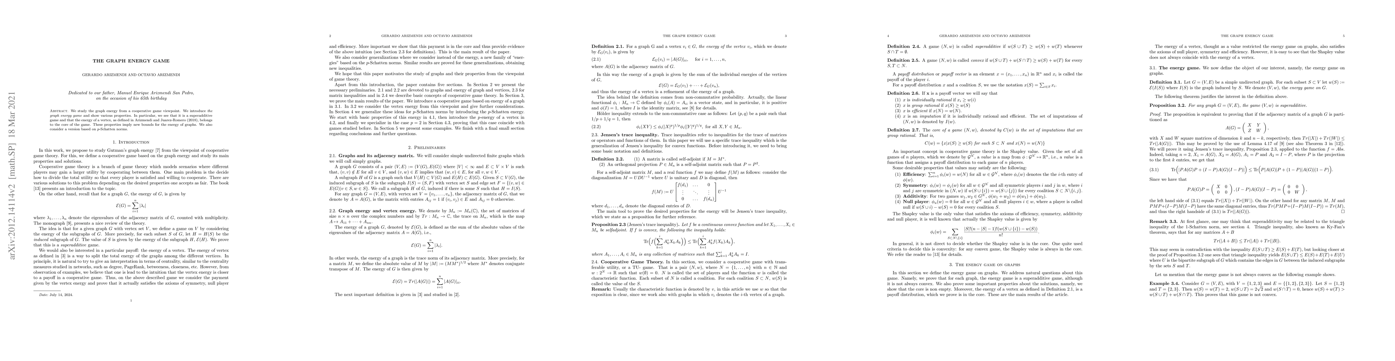 We study the graph energy from a cooperative game viewpoint. We introduce \emph{the graph energy game} and show various properties. In particular, we see that it is a superadditive game and that the energy of a vertex, as defined in Arizmendi and Juarez-Romero (2018), belongs to the core of the game. These properties imply new bounds for the energy of graphs. We also consider a version based on $p$-Schatten norms.