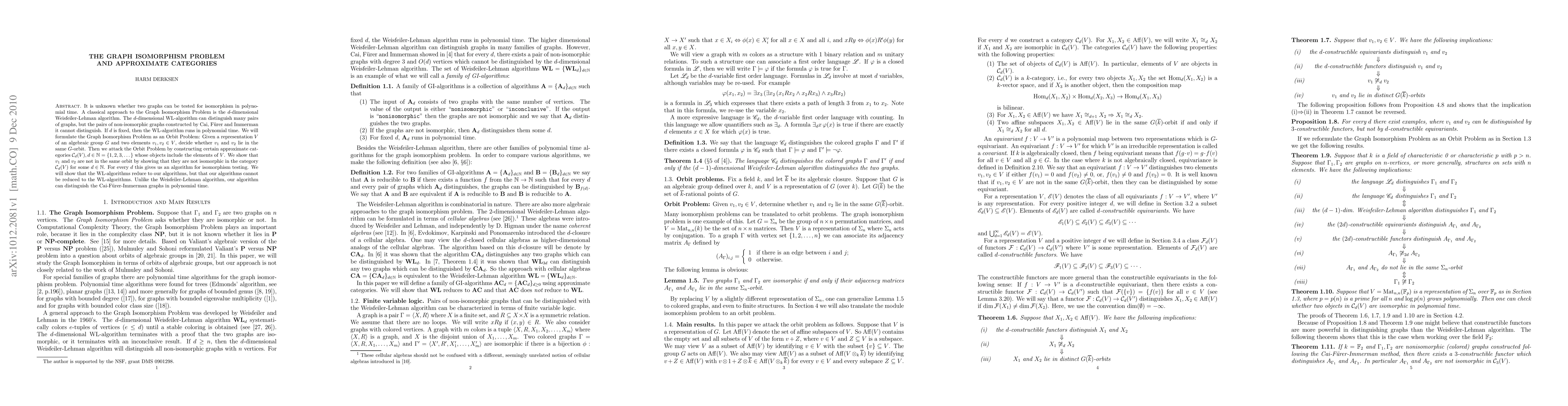 It is unknown whether two graphs can be tested for isomorphism in polynomial time. A classical approach to the Graph Isomorphism Problem is the d-dimensional Weisfeiler-Lehman algorithm. The d-dimensional WL-algorithm can distinguish many pairs of graphs, but the pairs of non-isomorphic graphs constructed by Cai, Furer and Immerman it cannot distinguish. If d is fixed, then the WL-algorithm runs in polynomial time. We will formulate the Graph Isomorphism Problem as an Orbit Problem: Given a representation V of an algebraic group G and two elements v_1,v_2 in V, decide whether v_1 and v_2 lie in the same G-orbit. Then we attack the Orbit Problem by constructing certain approximate categories C_d(V), d=1,2,3,... whose objects include the elements of V. We show that v_1 and v_2 are not in the same orbit by showing that they are not isomorphic in the category C_d(V) for some d. For every d this gives us an algorithm for isomorphism testing. We will show that the WL-algorithms reduce to our algorithms, but that our algorithms cannot be reduced to the WL-algorithms. Unlike the Weisfeiler-Lehman algorithm, our algorithm can distinguish the Cai-Furer-Immerman graphs in polynomial time.