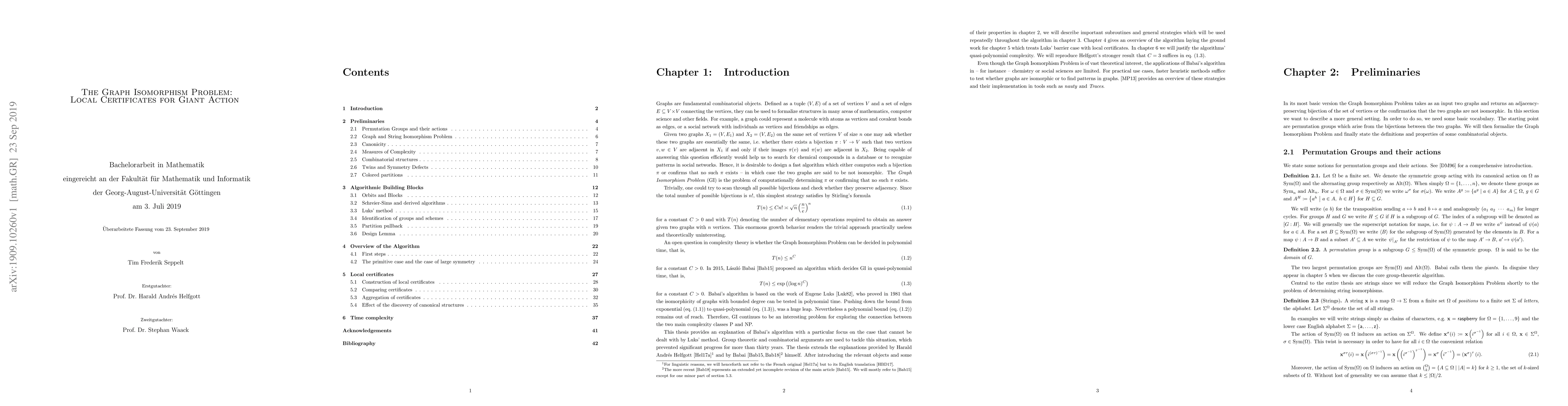 This thesis provides an explanation of L\'aszl\'o Babai's quasi-polynomial algorithm for the Graph Isomorphism Problem published in 2015 with a particular focus on the case of local certificates, i.e. the case that cannot be dealt with by Luks' method. The thesis extends the explanations provided by Harald Andr\'es Helfgott in 2017. It is concluded that the complexity of Babai's algorithm is $\exp\left(C \left(\log n\right)^3\right)$ for $n$ the number of vertices, $C$ a constant. Group theoretical and combinatorial arguments are used to give more details on Babai's method of local certificates. They treat Luks' barrier case in which the imprimitve permutation group $G$ can be mapped onto an alternating group with large domain.