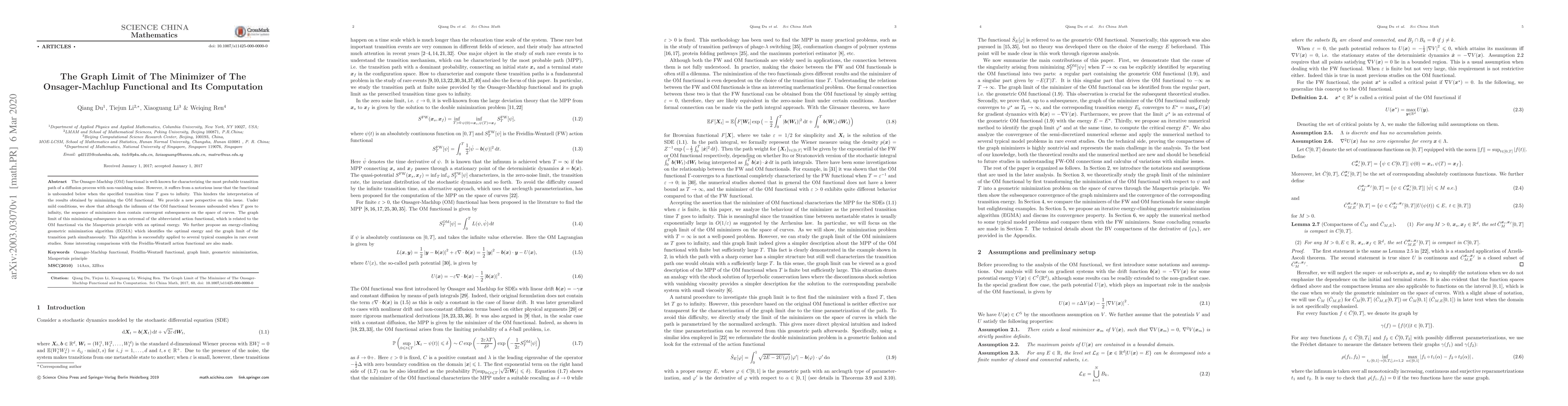 The Onsager-Machlup (OM) functional is well-known for characterizing the most probable transition path of a diffusion process with non-vanishing noise. However, it suffers from a notorious issue that the functional is unbounded below when the specified transition time $T$ goes to infinity. This hinders the interpretation of the results obtained by minimizing the OM functional. We provide a new perspective on this issue. Under mild conditions, we show that although the infimum of the OM functional becomes unbounded when $T$ goes to infinity, the sequence of minimizers does contain convergent subsequences on the space of curves. The graph limit of this minimizing subsequence is an extremal of the abbreviated action functional, which is related to the OM functional via the Maupertuis principle with an optimal energy. We further propose an energy-climbing geometric minimization algorithm (EGMA) which identifies the optimal energy and the graph limit of the transition path simultaneously. This algorithm is successfully applied to several typical examples in rare event studies. Some interesting comparisons with the Freidlin-Wentzell action functional are also made.