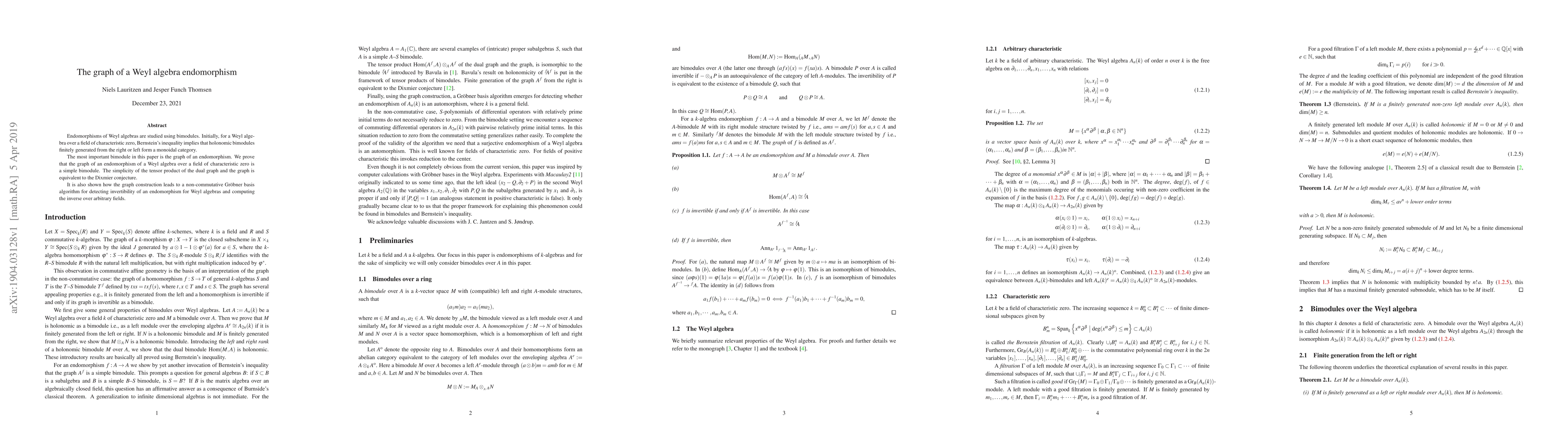 The paper establishes the simplicity of the graph of a Weyl algebra endomorphism as a bimodule and connects it to the Dixmier conjecture, while also developing a novel Groebner basis algorithm for endomorphism invertibility.