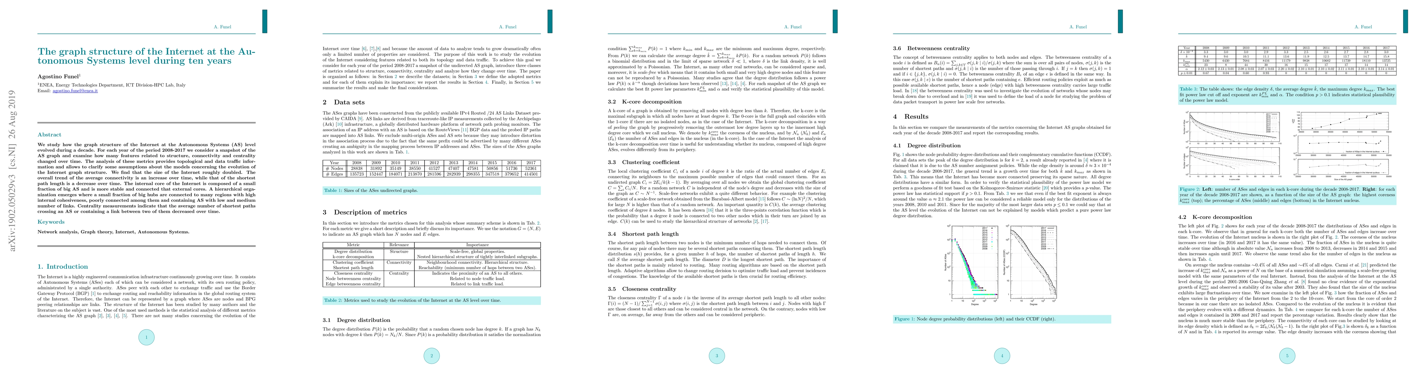 We study how the graph structure of the Internet at the Autonomous Systems (AS) level evolved during a decade. For each year of the period 2008-2017 we consider a snapshot of the AS graph and examine how many features related to structure, connectivity and centrality changed over time. The analysis of these metrics provides topological and data traffic information and allows to clarify some assumptions about the models concerning the evolution of the Internet graph structure. We find that the size of the Internet roughly doubled. The overall trend of the average connectivity is an increase over time, while that of the shortest path length is a decrease over time. The internal core of the Internet is composed of a small fraction of big AS and is more stable and connected that external cores. A hierarchical organization emerges where a small fraction of big hubs are connected to many regions with high internal cohesiveness, poorly connected among them and containing AS with low and medium number of links. Centrality measurements indicate that the average number of shortest paths crossing an AS or containing a link between two of them decreased over time.