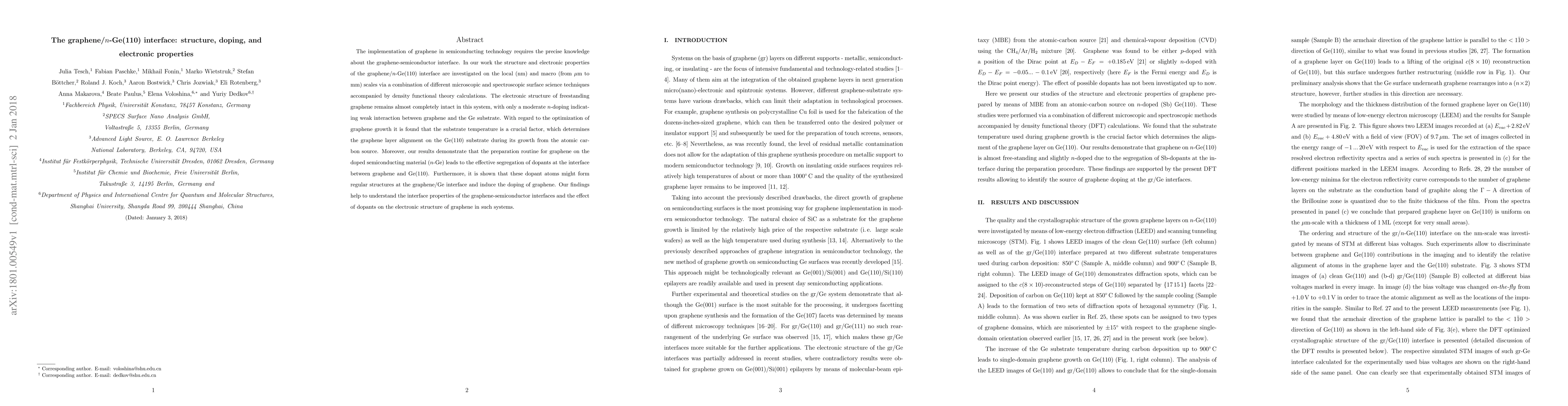 This study investigates the structure and electronic properties of the graphene/$n$-Ge(110) interface using surface science techniques and DFT calculations, revealing weak interaction, moderate n-doping, and the influence of substrate temperature on graphene growth. Dopants at the interface can induce graphene doping and form regular structures.