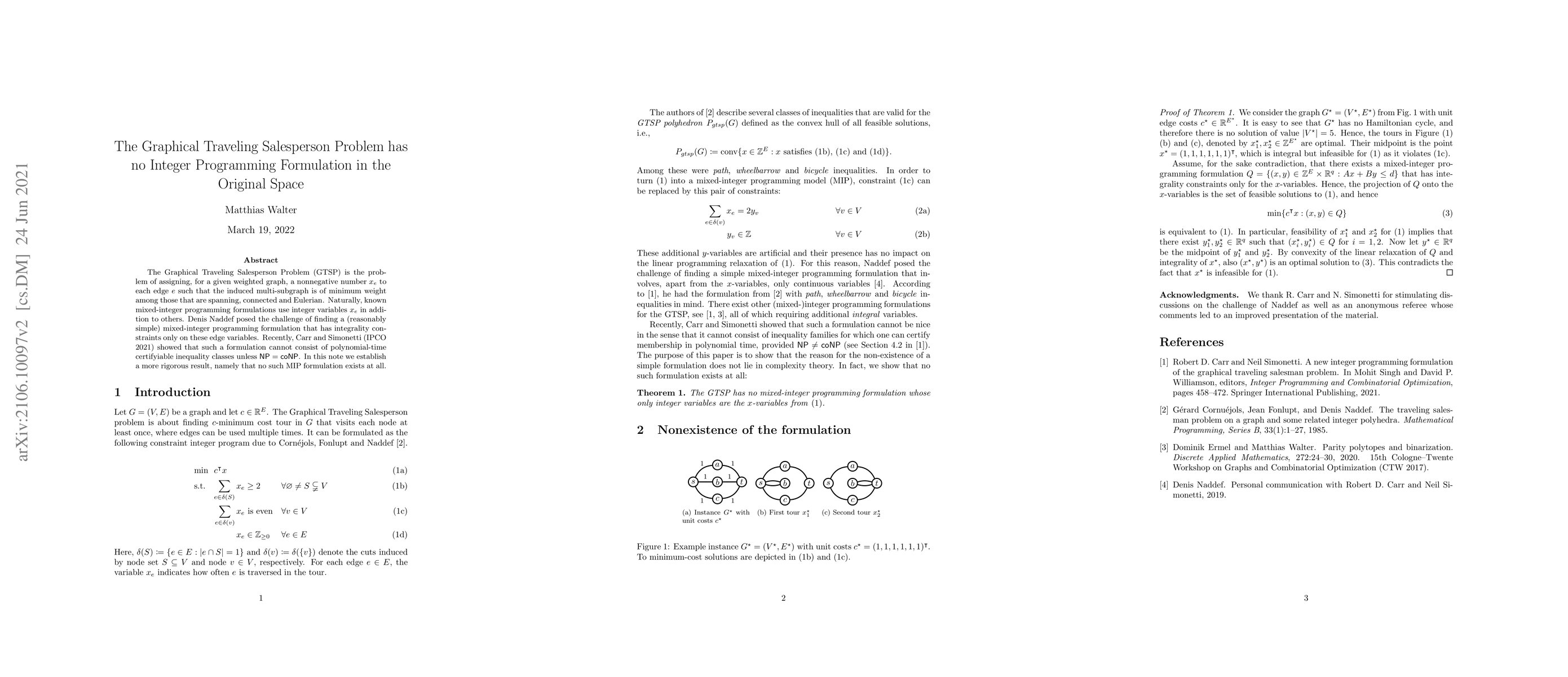 The Graphical Traveling Salesperson Problem (GTSP) is the problem of assigning, for a given weighted graph, a nonnegative number $x_e$ each edge $e$ such that the induced multi-subgraph is of minimum weight among those that are spanning, connected and Eulerian. Naturally, known mixed-integer programming formulations use integer variables $x_e$ in addition to others. Denis Naddef posed the challenge of finding a (reasonably simple) mixed-integer programming formulation that has integrality constraints only on these edge variables. Recently, Carr and Simonetti (IPCO 2021) showed that such a formulation cannot consist of polynomial-time certifyiable inequality classes unless $\mathsf{NP}=\mathsf{coNP}$. In this note we establish a more rigorous result, namely that no such MIP formulation exists at all.