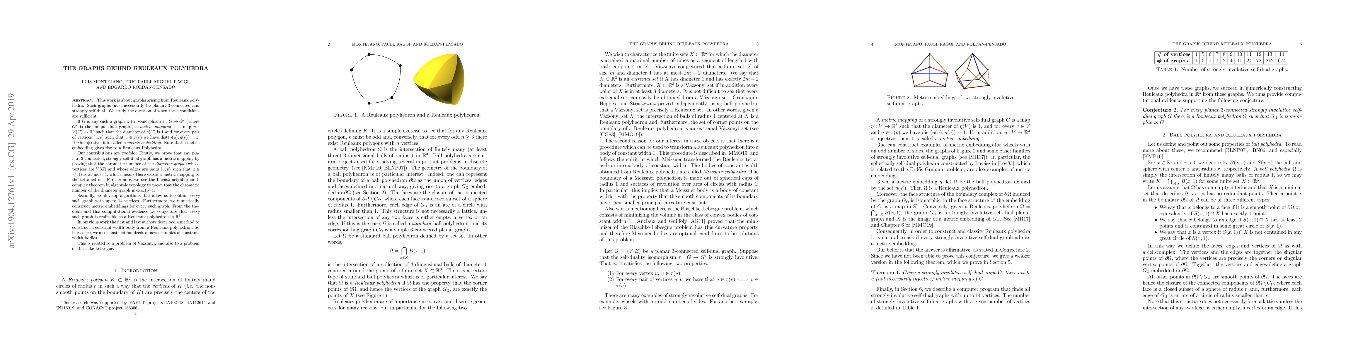 This work is about graphs arising from Reuleaux polyhedra. Such graphs must necessarily be planar, $3$-connected and strongly self-dual. We study the question of when these conditions are sufficient. If $G$ is any such a graph with isomorphism $\tau : G \to G^*$ (where $G^*$ is the unique dual graph), a metric mapping is a map $\eta : V(G) \to \mathbb R^3$ such that the diameter of $\eta(G)$ is $1$ and for every pair of vertices $(u,v)$ such that $u\in \tau(v)$ we have dist$(\eta(u),\eta(v)) = 1$. If $\eta$ is injective, it is called a metric embedding. Note that a metric embedding gives rise to a Reuleaux Polyhedra. Our contributions are twofold: Firstly, we prove that any planar, $3$-connected, strongly self-dual graph has a metric mapping by proving that the chromatic number of the diameter graph (whose vertices are $V(G)$ and whose edges are pairs $(u,v)$ such that $u\in \tau(v)$) is at most $4$, which means there exists a metric mapping to the tetrahedron. Furthermore, we use the Lov\'asz neighborhood-complex theorem in algebraic topology to prove that the chromatic number of the diameter graph is exactly $4$. Secondly, we develop algorithms that allow us to obtain every such graph with up to $14$ vertices. Furthermore, we numerically construct metric embeddings for every such graph. From the theorem and this computational evidence we conjecture that every such graph is realizable as a Reuleaux polyhedron in $\mathbb R^3$. In previous work the first and last authors described a method to construct a constant-width body from a Reuleaux polyhedron. So in essence, we also construct hundreds of new examples of constant-width bodies. This is related to a problem of V\'azsonyi, and also to a problem of Blaschke-Lebesgue.