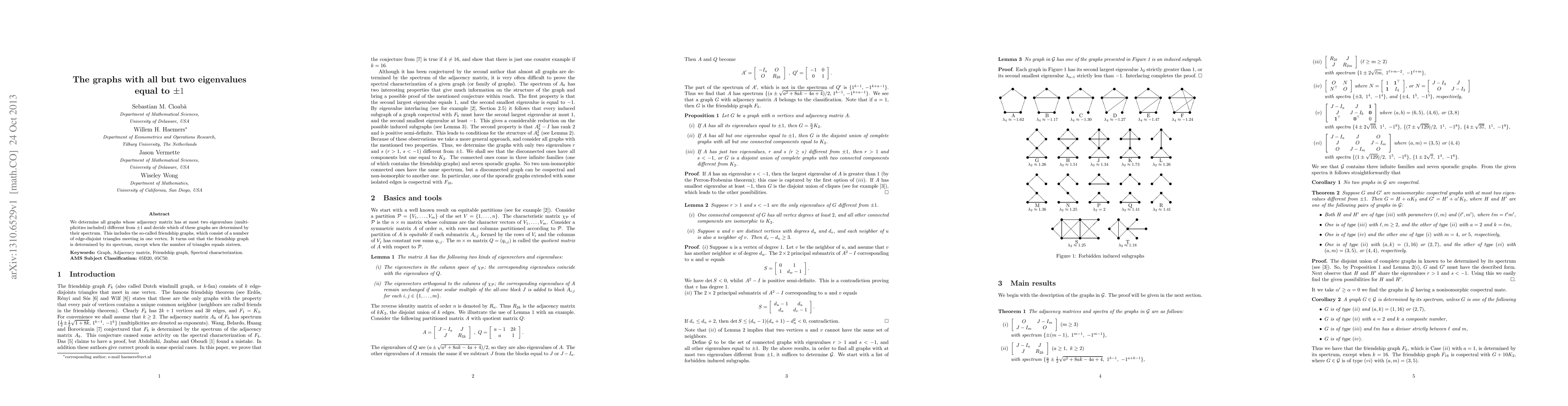 This paper identifies all graphs with adjacency matrices having at most two eigenvalues other than $pm 1$. It confirms friendship graphs, composed of multiple edge-disjoint triangles, are spectrum-determined except when there are sixteen triangles.