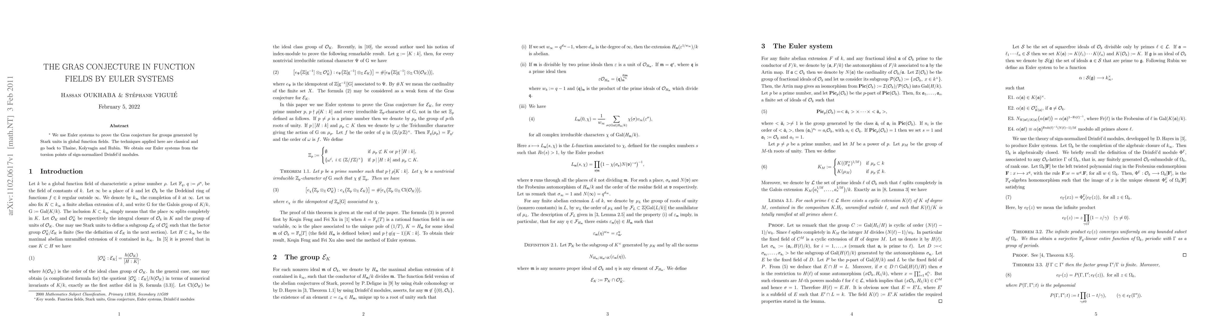 Summary: This paper proves the Gras conjecture for groups generated by Stark units in global function fields using Euler systems, leveraging classical techniques from Thaine, Kolyvagin, and Rubin, and deriving Euler systems from the torsion points of sign-normalized Drinfel'd modules.