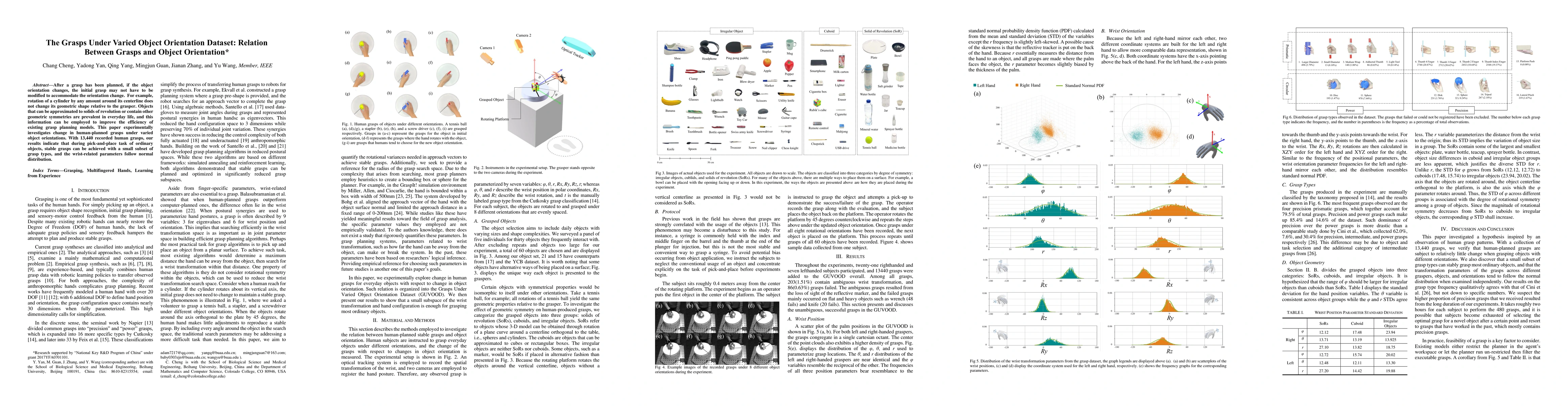 After a grasp has been planned, if the object orientation changes, the initial grasp may not have to be modified to accommodate the orientation change. For example, rotation of a cylinder by any amount around its centerline does not change its geometric shape relative to the grasper. Objects that can be approximated to solids of revolution or contain other geometric symmetries are prevalent in everyday life, and this information can be employed to improve the efficiency of existing grasp planning models. This paper experimentally investigates change in human-planned grasps under varied object orientations. With 13,440 recorded human grasps, our results indicate that during pick-and-place task of ordinary objects, stable grasps can be achieved with a small subset of grasp types, and the wrist-related parameters follow normal distribution.