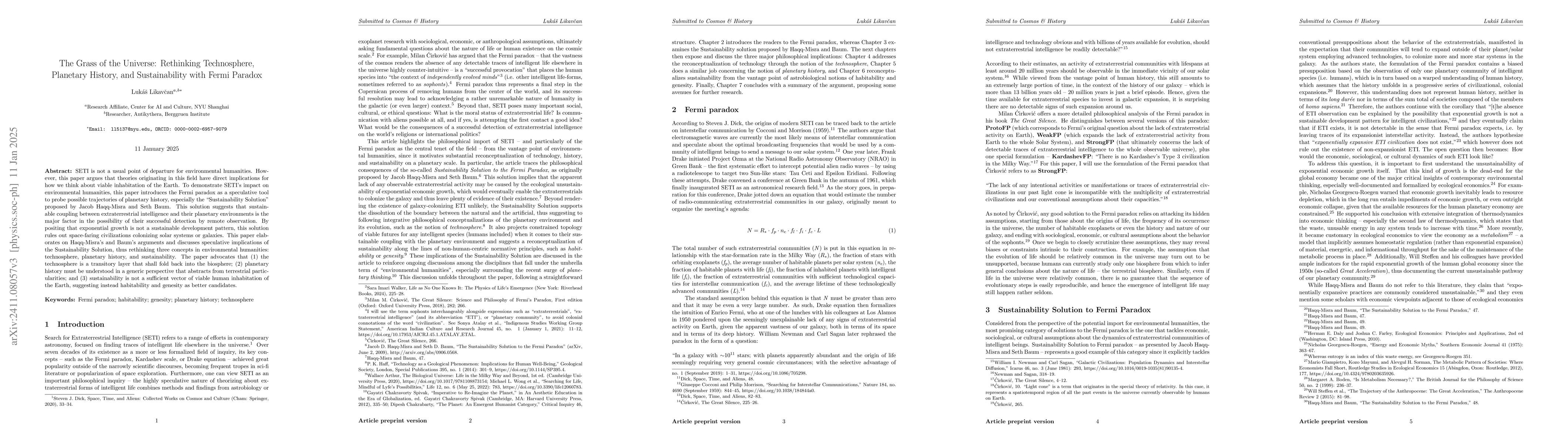 SETI is not a usual point of departure for environmental humanities. However, this paper argues that theories originating in this field have direct implications for how we think about viable inhabitation of the Earth. To demonstrate SETI's impact on environmental humanities, this paper introduces Fermi paradox as a speculative tool to probe possible trajectories of planetary history, and especially the "Sustainability Solution" proposed by Jacob Haqq-Misra and Seth Baum. This solution suggests that sustainable coupling between extraterrestrial intelligences and their planetary environments is the major factor in the possibility of their successful detection by remote observation. By positing that exponential growth is not a sustainable development pattern, this solution rules out space-faring civilizations colonizing solar systems or galaxies. This paper elaborates on Haqq-Misra's and Baum's arguments, and discusses speculative implications of the Sustainability Solution, thus rethinking three concepts in environmental humanities: technosphere, planetary history, and sustainability. The paper advocates that (1) technosphere is a transitory layer that shall fold back into biosphere; (2) planetary history must be understood in a generic perspective that abstracts from terrestrial particularities; and (3) sustainability is not sufficient vector of viable human inhabitation of the Earth, suggesting instead habitability and genesity as better candidates.