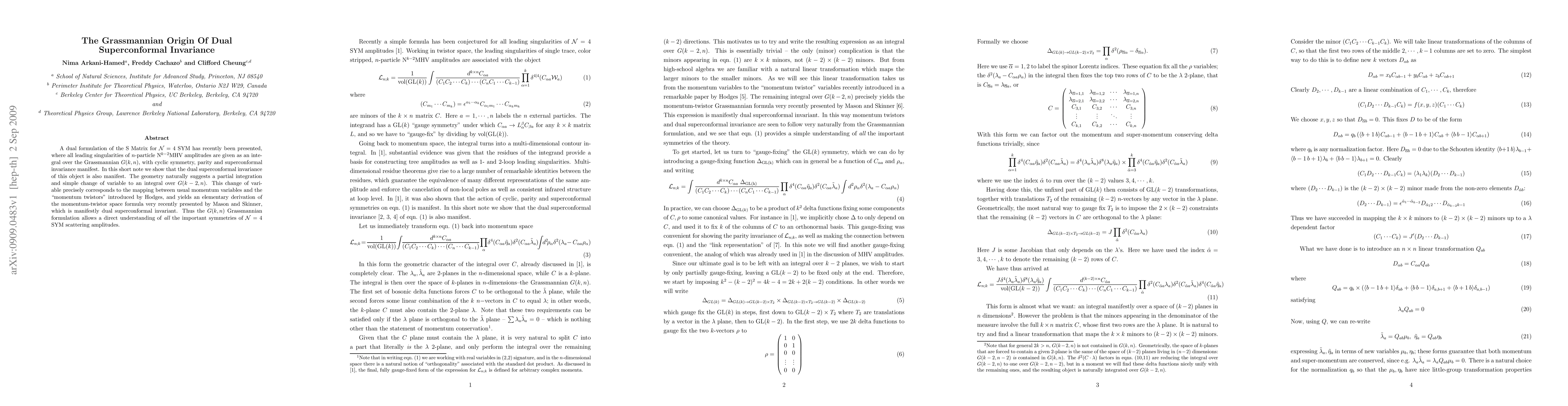 This paper demonstrates that the dual formulation of the S Matrix for N=4 Super Yang-Mills theory reveals leading singularities through integrals over the Grassmannian G(k,n), highlighting dual superconformal invariance. The Grassmannian approach provides a straightforward derivation of the momentum-twistor space formula, directly elucidating key symmetries in N=4 SYM scattering amplitudes.