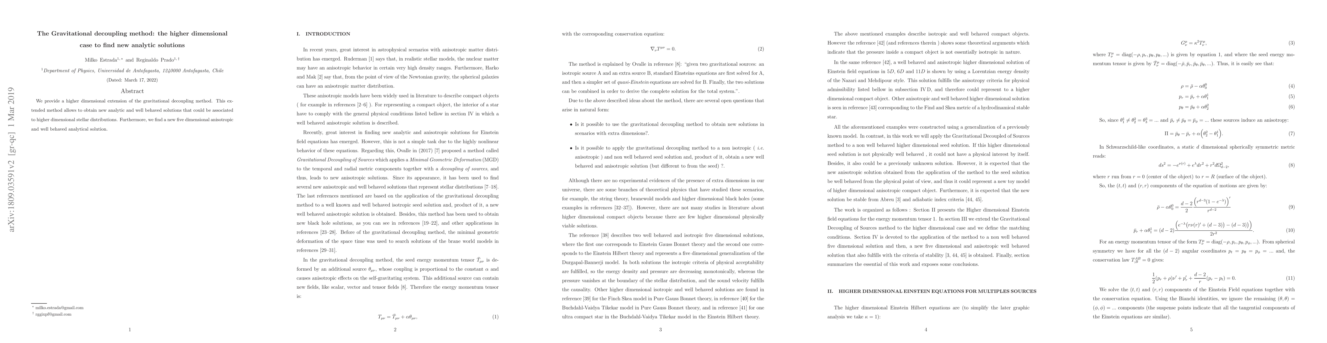 Summary: The paper extends the gravitational decoupling method to higher dimensions, yielding new analytic solutions for higher dimensional stellar distributions, including a novel five-dimensional anisotropic analytical solution.