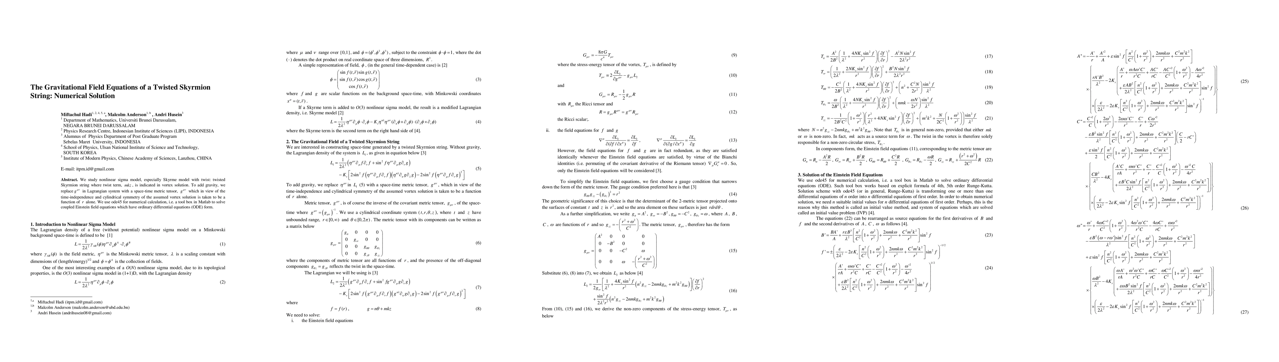 This research numerically solves the Einstein field equations for a twisted Skyrmion string, a model from nonlinear sigma model, using Matlab's ode45 toolbox. The study considers a time-independent, cylindrically symmetric vortex solution with a gravitational field, represented by a metric tensor dependent on radial distance alone.