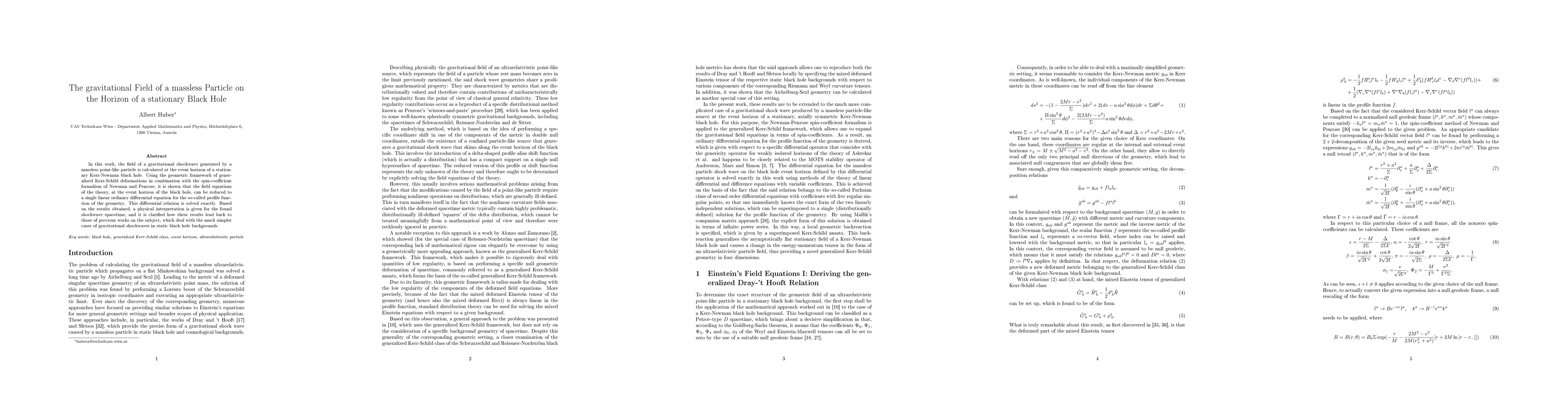 In this work, the field of a gravitational shockwave generated by a massless point-like particle is calculated at the event horizon of a stationary Kerr-Newman black hole. Using the geometric framework of generalized Kerr-Schild deformations in combination with the spin-coefficient formalism of Newman and Penrose, it is shown that the field equations of the theory, at the event horizon of the black hole, can be reduced to a single linear ordinary differential equation for the so-called profile function of the geometry. This differential relation is solved exactly. Based on the results obtained, a physical interpretation is given for the found shockwave spacetime, and it is clarified how these results lead back to those of previous works on the subject, which deal with the much simpler cases of gravitational shockwaves in static black hole backgrounds.