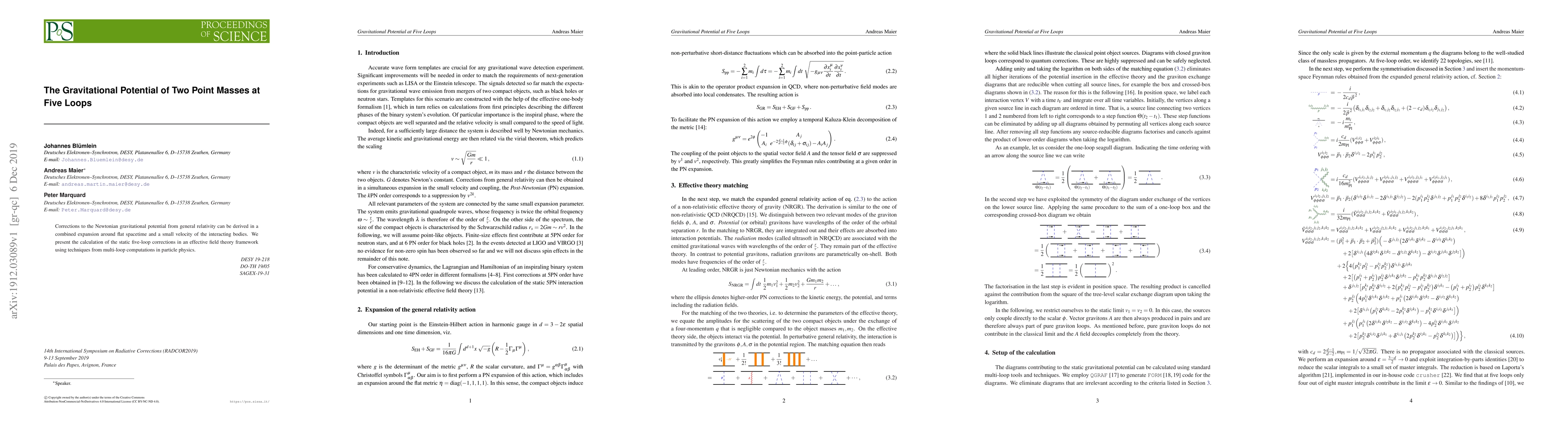 Corrections to the Newtonian gravitational potential from general relativity can be derived in a combined expansion around flat spacetime and a small velocity of the interacting bodies. We present the calculation of the static five-loop corrections in an effective field theory framework using techniques from multi-loop computations in particle physics.