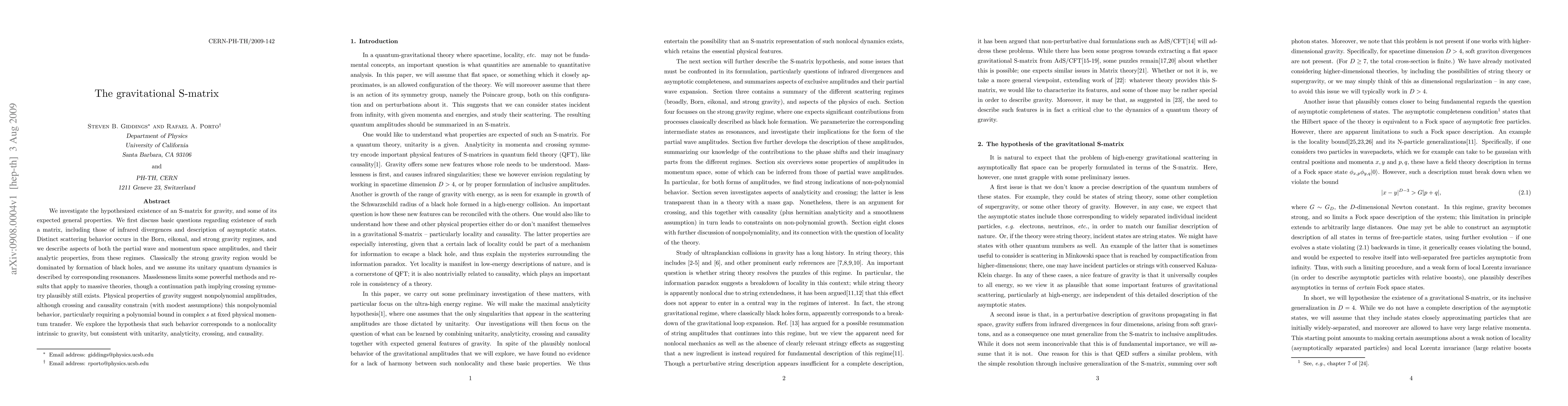 We investigate the hypothesized existence of an S-matrix for gravity, and some of its expected general properties. We first discuss basic questions regarding existence of such a matrix, including those of infrared divergences and description of asymptotic states. Distinct scattering behavior occurs in the Born, eikonal, and strong gravity regimes, and we describe aspects of both the partial wave and momentum space amplitudes, and their analytic properties, from these regimes. Classically the strong gravity region would be dominated by formation of black holes, and we assume its unitary quantum dynamics is described by corresponding resonances. Masslessness limits some powerful methods and results that apply to massive theories, though a continuation path implying crossing symmetry plausibly still exists. Physical properties of gravity suggest nonpolynomial amplitudes, although crossing and causality constrain (with modest assumptions) this nonpolynomial behavior, particularly requiring a polynomial bound in complex s at fixed physical momentum transfer. We explore the hypothesis that such behavior corresponds to a nonlocality intrinsic to gravity, but consistent with unitarity, analyticity, crossing, and causality.