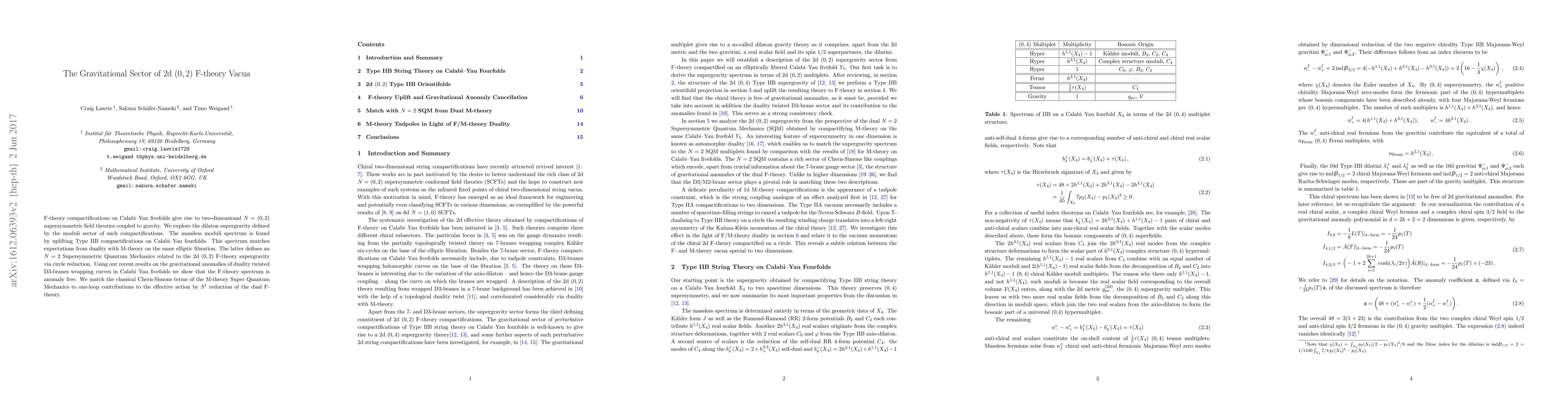 F-theory compactifications on Calabi-Yau fivefolds give rise to two-dimensional N=(0,2) supersymmetric field theories coupled to gravity. We explore the dilaton supergravity defined by the moduli sector of such compactifications. The massless moduli spectrum is found by uplifting Type IIB compactifications on Calabi-Yau fourfolds. This spectrum matches expectations from duality with M-theory on the same elliptic fibration. The latter defines an N=2 Supersymmetric Quantum Mechanics related to the 2d (0,2) F-theory supergravity via circle reduction. Using our recent results on the gravitational anomalies of duality twisted D3-branes wrapping curves in Calabi-Yau fivefolds we show that the F-theory spectrum is anomaly free. We match the classical Chern-Simons terms of the M-theory Super Quantum Mechanics to one-loop contributions to the effective action by S^1 reduction of the dual F-theory.