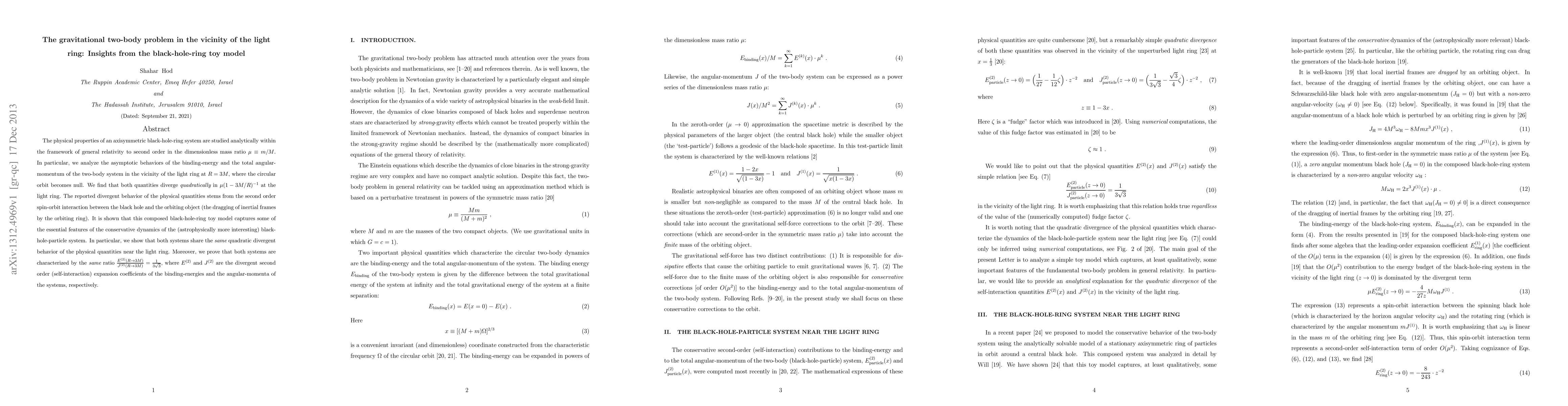 The physical properties of an axisymmetric black-hole-ring system are studied analytically within the framework of general relativity to second order in the dimensionless mass ratio $\mu\equiv m/M$. In particular, we analyze the asymptotic behaviors of the binding-energy and the total angular-momentum of the two-body system in the vicinity of the light ring at $R=3M$, where the circular orbit becomes null. We find that both quantities diverge {\it quadratically} in $\mu(1-3M/R)^{-1}$ at the light ring. The reported divergent behavior of the physical quantities stems from the second order spin-orbit interaction between the black hole and the orbiting object (the dragging of inertial frames by the orbiting ring). It is shown that this composed black-hole-ring toy model captures some of the essential features of the conservative dynamics of the (astrophysically more interesting) black-hole-particle system. In particular, we show that both systems share the {\it same} quadratic divergent behavior of the physical quantities near the light ring. Moreover, we prove that both systems are characterized by the {\it same} ratio ${{E^{(2)}(R\to 3M)}\over{J^{(2)}(R\to 3M)}}={{1}\over{3\sqrt{3}}}$, where $E^{(2)}$ and $J^{(2)}$ are the divergent second order (self-interaction) expansion coefficients of the binding-energies and the angular-momenta of the systems, respectively.