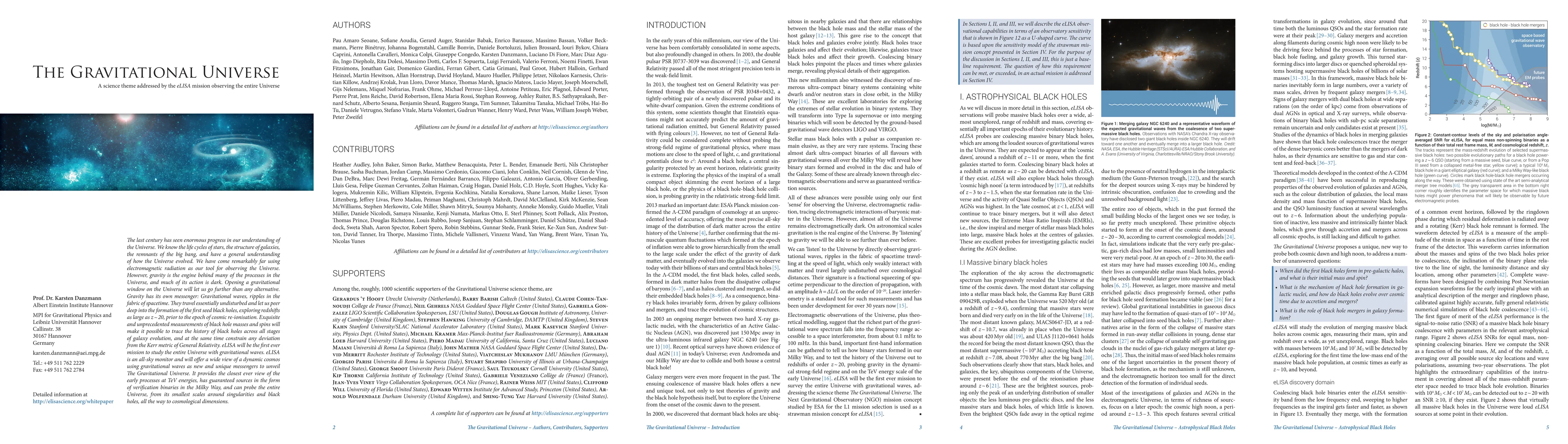 The last century has seen enormous progress in our understanding of the Universe. We know the life cycles of stars, the structure of galaxies, the remnants of the big bang, and have a general understanding of how the Universe evolved. We have come remarkably far using electromagnetic radiation as our tool for observing the Universe. However, gravity is the engine behind many of the processes in the Universe, and much of its action is dark. Opening a gravitational window on the Universe will let us go further than any alternative. Gravity has its own messenger: Gravitational waves, ripples in the fabric of spacetime. They travel essentially undisturbed and let us peer deep into the formation of the first seed black holes, exploring redshifts as large as z ~ 20, prior to the epoch of cosmic re-ionisation. Exquisite and unprecedented measurements of black hole masses and spins will make it possible to trace the history of black holes across all stages of galaxy evolution, and at the same time constrain any deviation from the Kerr metric of General Relativity. eLISA will be the first ever mission to study the entire Universe with gravitational waves. eLISA is an all-sky monitor and will offer a wide view of a dynamic cosmos using gravitational waves as new and unique messengers to unveil The Gravitational Universe. It provides the closest ever view of the early processes at TeV energies, has guaranteed sources in the form of verification binaries in the Milky Way, and can probe the entire Universe, from its smallest scales around singularities and black holes, all the way to cosmological dimensions.