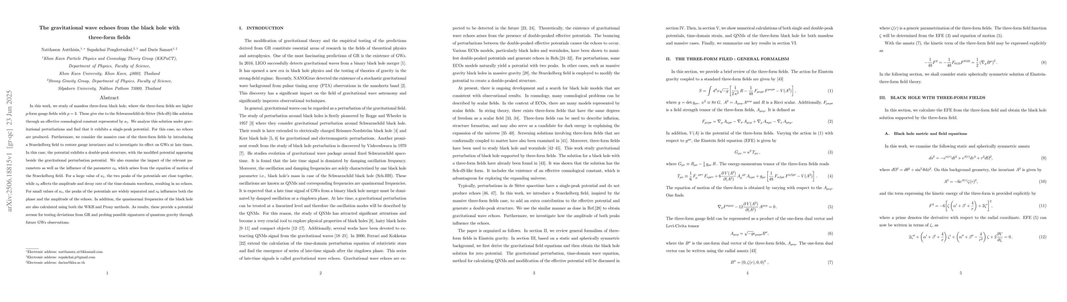 This research explores massless and massive three-form black hole solutions, finding that massless ones don't produce gravitational wave echoes, while massive ones do under specific conditions. The study analyzes the effects of parameters like $a_1$ and $c_0$ on echoes and waveforms, suggesting future GW observations could test General Relativity and probe quantum gravity signatures.