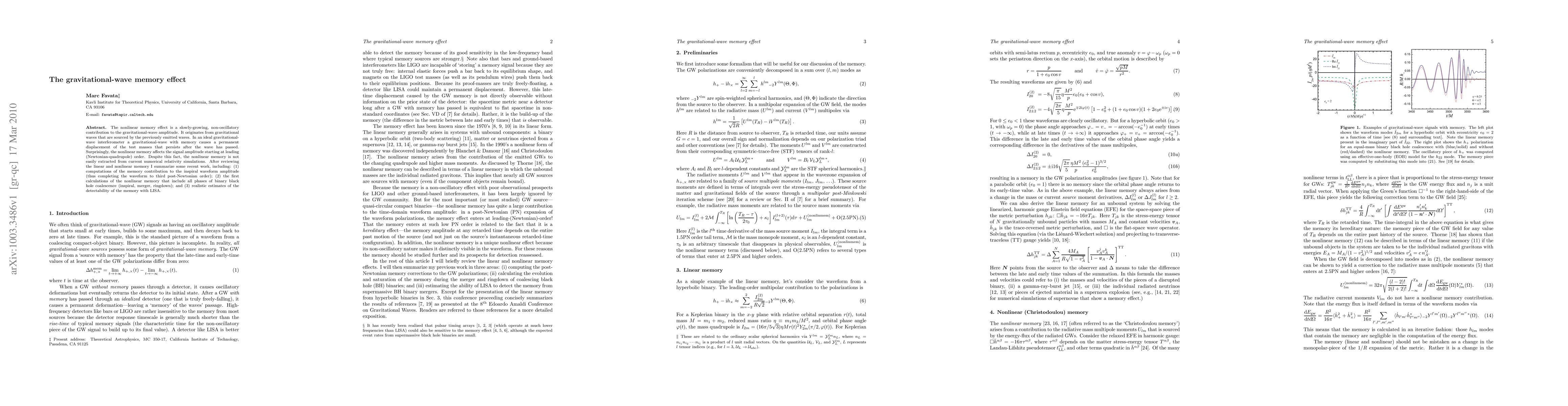 The nonlinear memory effect is a slowly-growing, non-oscillatory contribution to the gravitational-wave amplitude. It originates from gravitational waves that are sourced by the previously emitted waves. In an ideal gravitational-wave interferometer a gravitational-wave with memory causes a permanent displacement of the test masses that persists after the wave has passed. Surprisingly, the nonlinear memory affects the signal amplitude starting at leading (Newtonian-quadrupole) order. Despite this fact, the nonlinear memory is not easily extracted from current numerical relativity simulations. After reviewing the linear and nonlinear memory I summarize some recent work, including: (1) computations of the memory contribution to the inspiral waveform amplitude (thus completing the waveform to third post-Newtonian order); (2) the first calculations of the nonlinear memory that include all phases of binary black hole coalescence (inspiral, merger, ringdown); and (3) realistic estimates of the detectability of the memory with LISA.
