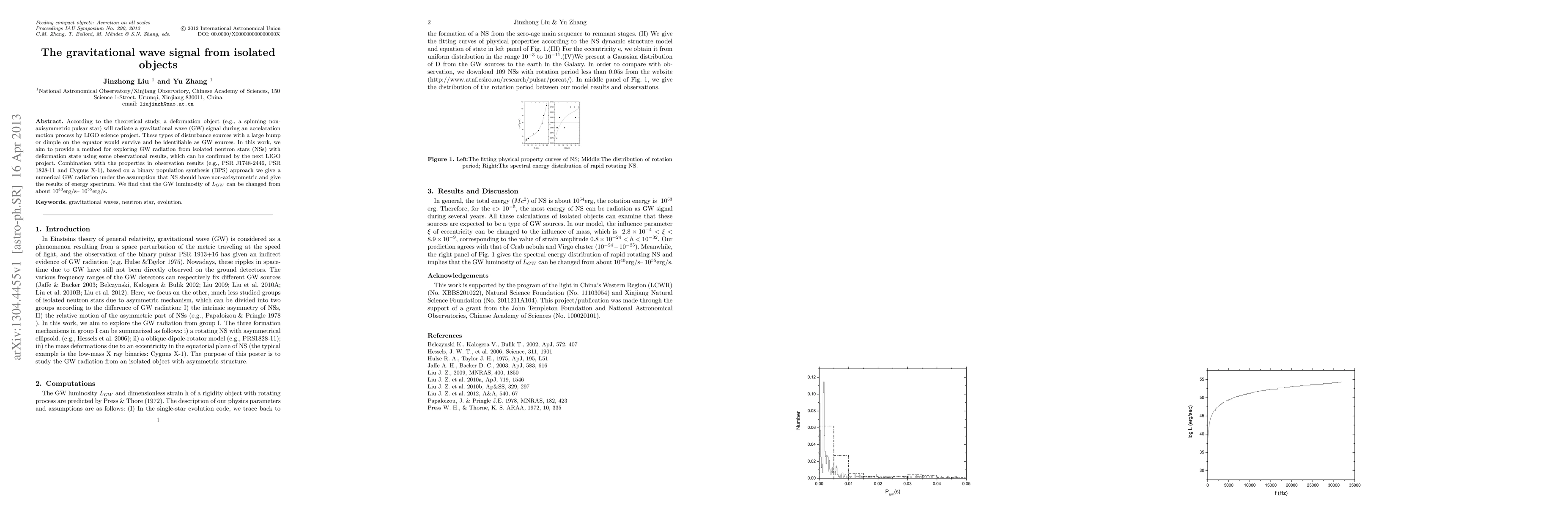 According to the theoretical study, a deformation object (e.g., a spinning non-axisymmetric pulsar star) will radiate a gravitational wave (GW) signal during an accelaration motion process by LIGO science project. These types of disturbance sources with a large bump or dimple on the equator would survive and be identifiable as GW sources. In this work, we aim to provide a method for exploring GW radiation from isolated neutron stars (NSs) with deformation state using some observational results, which can be confirmed by the next LIGO project. Combination with the properties in observation results (e.g., PSR J1748-2446, PSR 1828-11 and Cygnus X-1), based on a binary population synthesis (BPS) approach we give a numerical GW radiation under the assumption that NS should have non-axisymmetric and give the results of energy spectrum. We find that the GW luminosity of $L_{GW}$ can be changed from about $10^{40}\rm erg/s$-- $10^{55}\rm erg/s$.