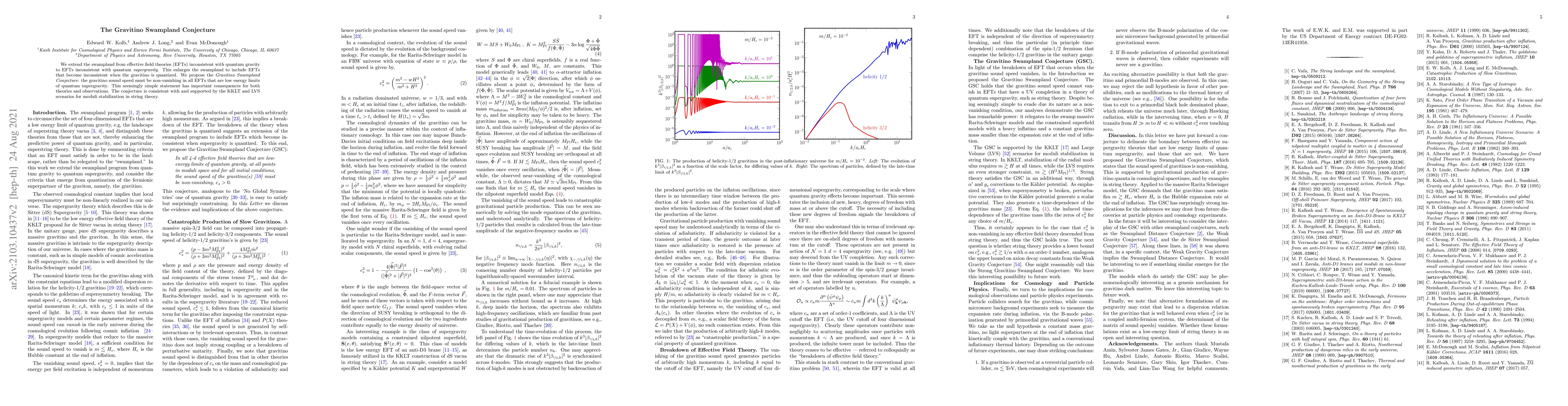 The Gravitino Swampland Conjecture posits that the gravitino's sound speed must be non-zero in effective field theories consistent with quantum supergravity, with implications for both theoretical frameworks and observational cosmology. The conjecture is supported by scenarios like KKLT and LVS for moduli stabilization in string theory.