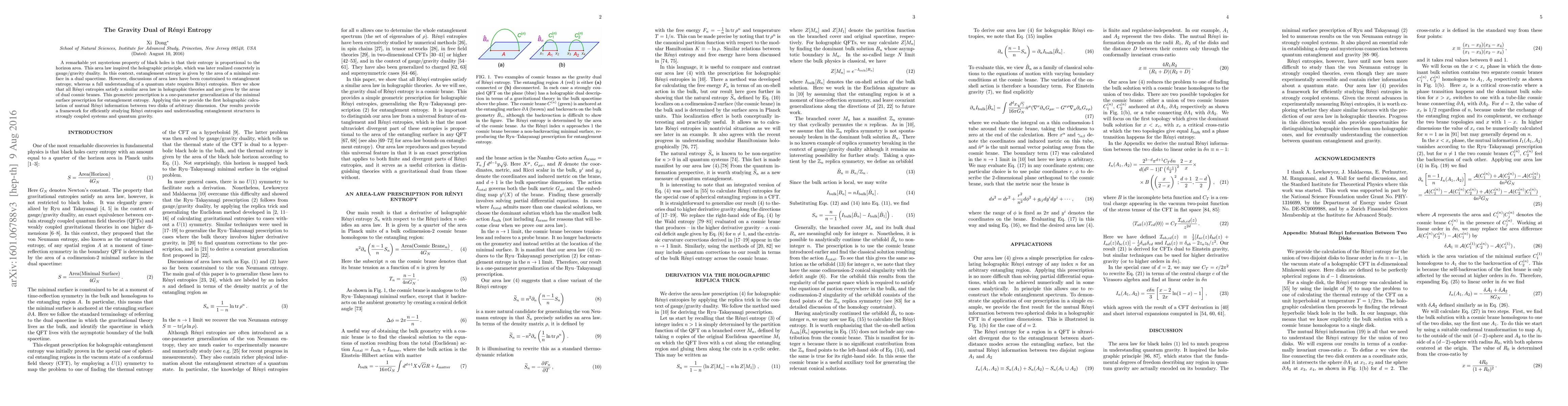 This paper demonstrates that Renyi entropies in holographic theories follow an area law, analogous to entanglement entropy, given by the areas of cosmic branes in the dual spacetime. It provides the first holographic calculation of mutual Renyi information, offering a framework for studying entanglement structures in strongly coupled quantum systems and quantum gravity.