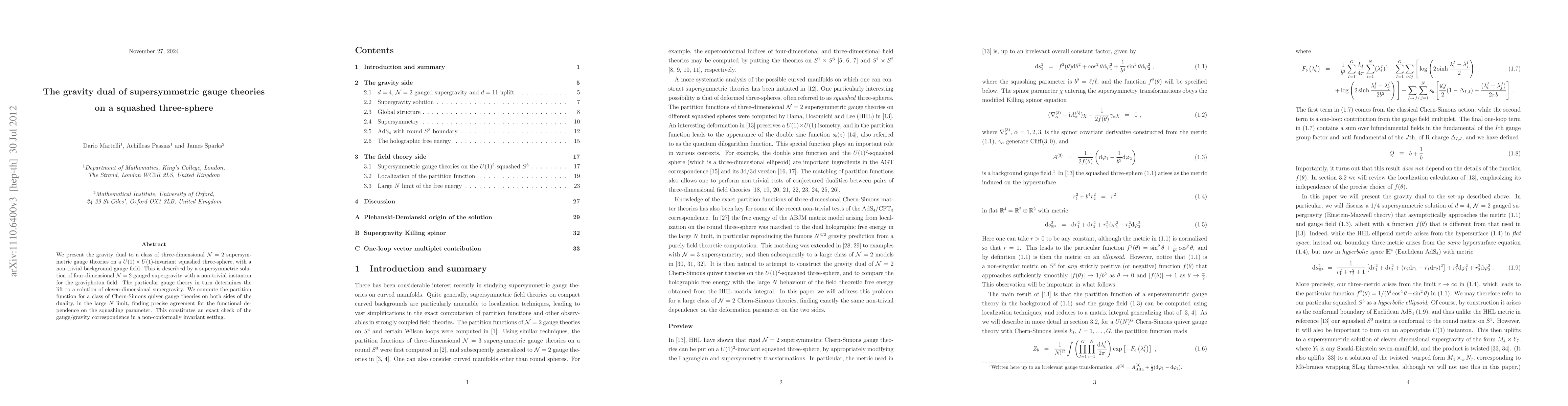 We present the gravity dual to a class of three-dimensional N=2 supersymmetric gauge theories on a U(1) x U(1)-invariant squashed three-sphere, with a non-trivial background gauge field. This is described by a supersymmetric solution of four-dimensional N=2 gauged supergravity with a non-trivial instanton for the graviphoton field. The particular gauge theory in turn determines the lift to a solution of eleven-dimensional supergravity. We compute the partition function for a class of Chern-Simons quiver gauge theories on both sides of the duality, in the large N limit, finding precise agreement for the functional dependence on the squashing parameter. This constitutes an exact check of the gauge/gravity correspondence in a non-conformally invariant setting.