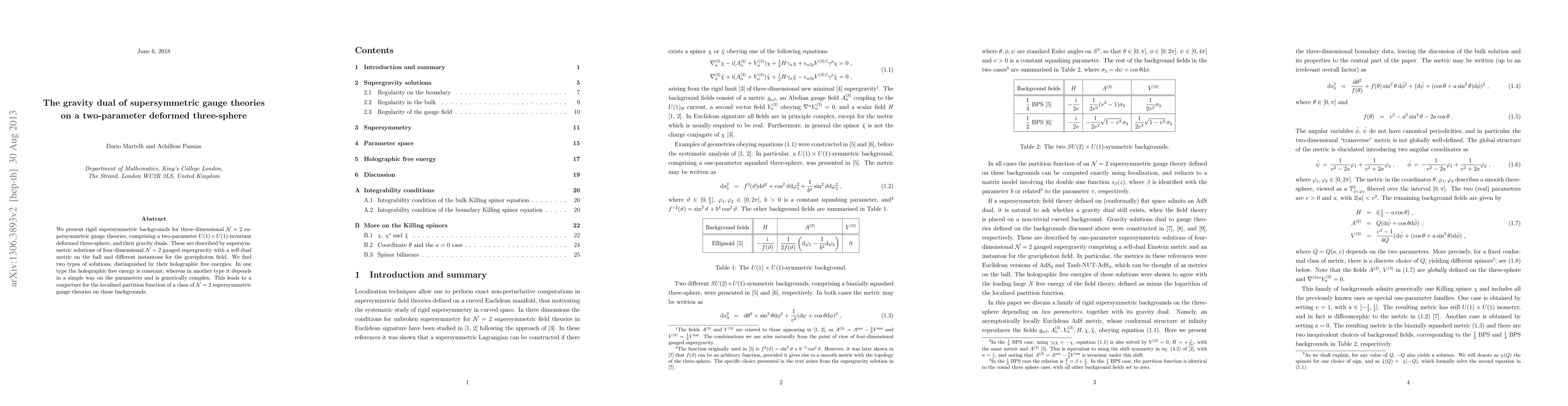 This research presents supersymmetric backgrounds for three-dimensional N=2 gauge theories featuring a deformed three-sphere and their gravity duals described by four-dimensional N=2 gauged supergravity. Two types of solutions are identified based on their holographic free energies, leading to a conjecture for the localized partition function of the gauge theories.